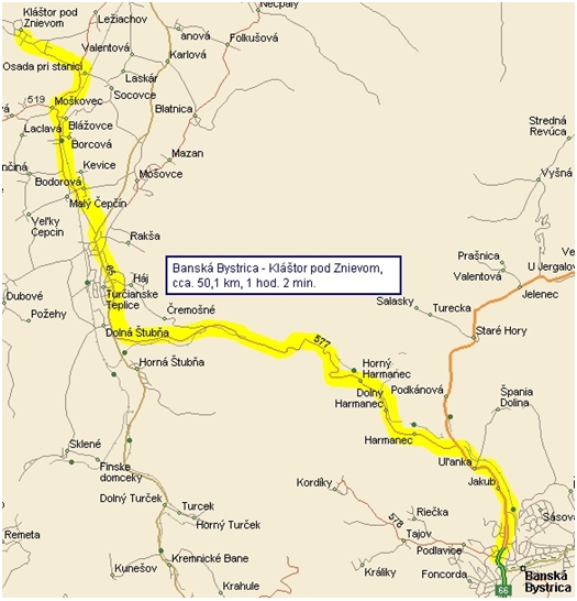 Z Banskej Bystrice choďte cestou E77 smerom na Donovaly a Ružomberok, z ktorej odbočíte na cestu 577 na Turčianske Teplice za obcou Uľanka. Cesta 577 vedie cez obce Harmanec, Dolný a Horný Harmanec cez horský prechod Šturec. Pred Turčianskymi Teplicami odbočte doprava na cestu 65 smerom na Martin, obídete Turčianske Teplice a dostanete sa do časti Turčianske Teplice – Diviaky, kde pri futbalovom štadióne zídete po odbočení doľava z hlavnej cesty smerujúcej ďalej do Martina. Vojdete do križovatky, na ktorej musíte odbočiť doprava. Prejdete obce Malý Čepčín a Jazernica a dostanete sa k mostu cez Turiec, za ktorým v obci Moškovec odbočíte smerom doprava na Martin, obídete obec Turčiansky Ďur a uvidíte plničku minerálnej vody Kláštorná. Smerom doprava sa nachádza časť Kláštor pod Znievom – stanica, smerom doľava (po prejdení ďalších cca. 200 m) je odbočka vedúca priamo do obce Kláštor pod Znievom.