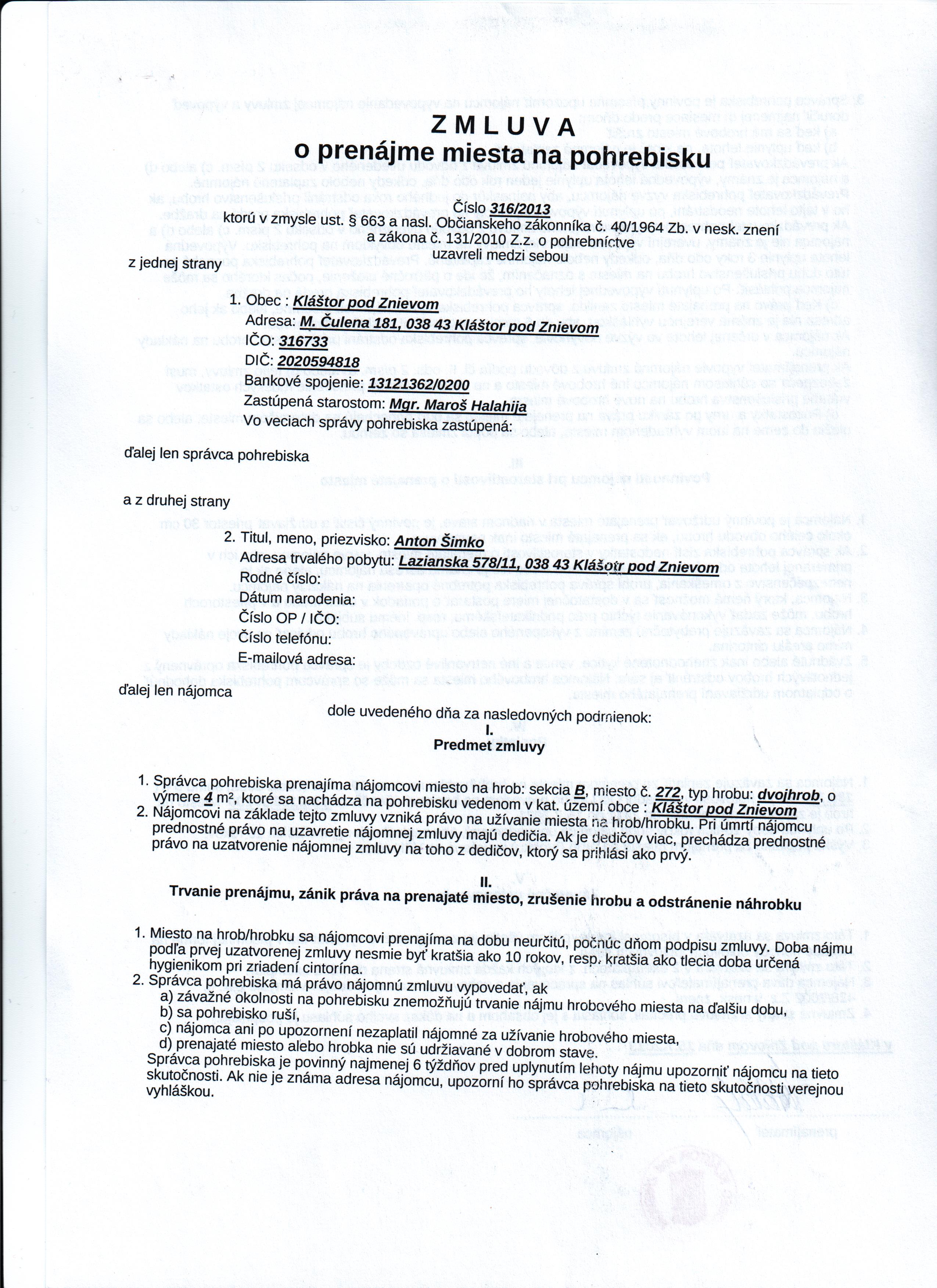 | Názov: | Zmluva o prenájme miesta na pohrebisku |