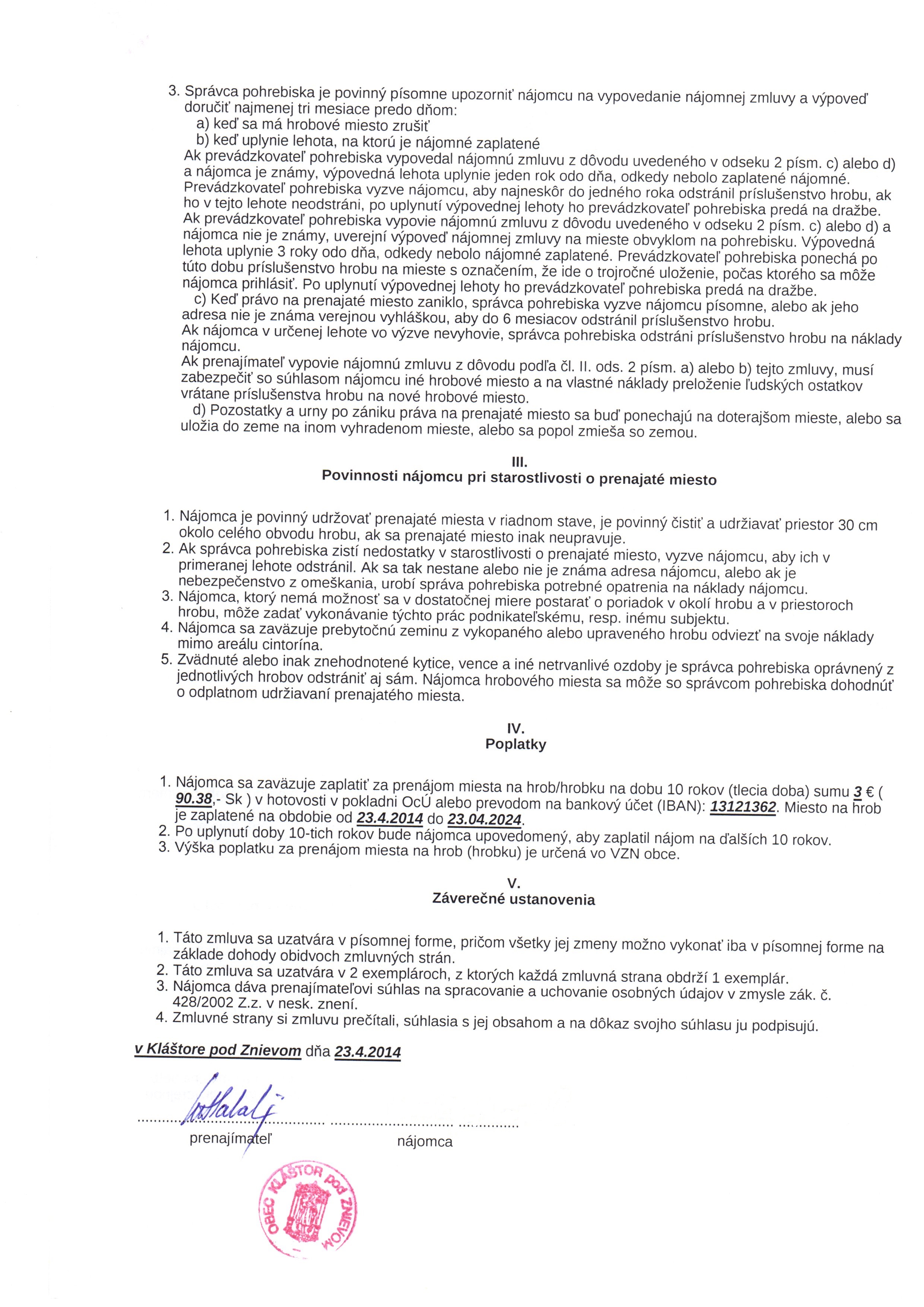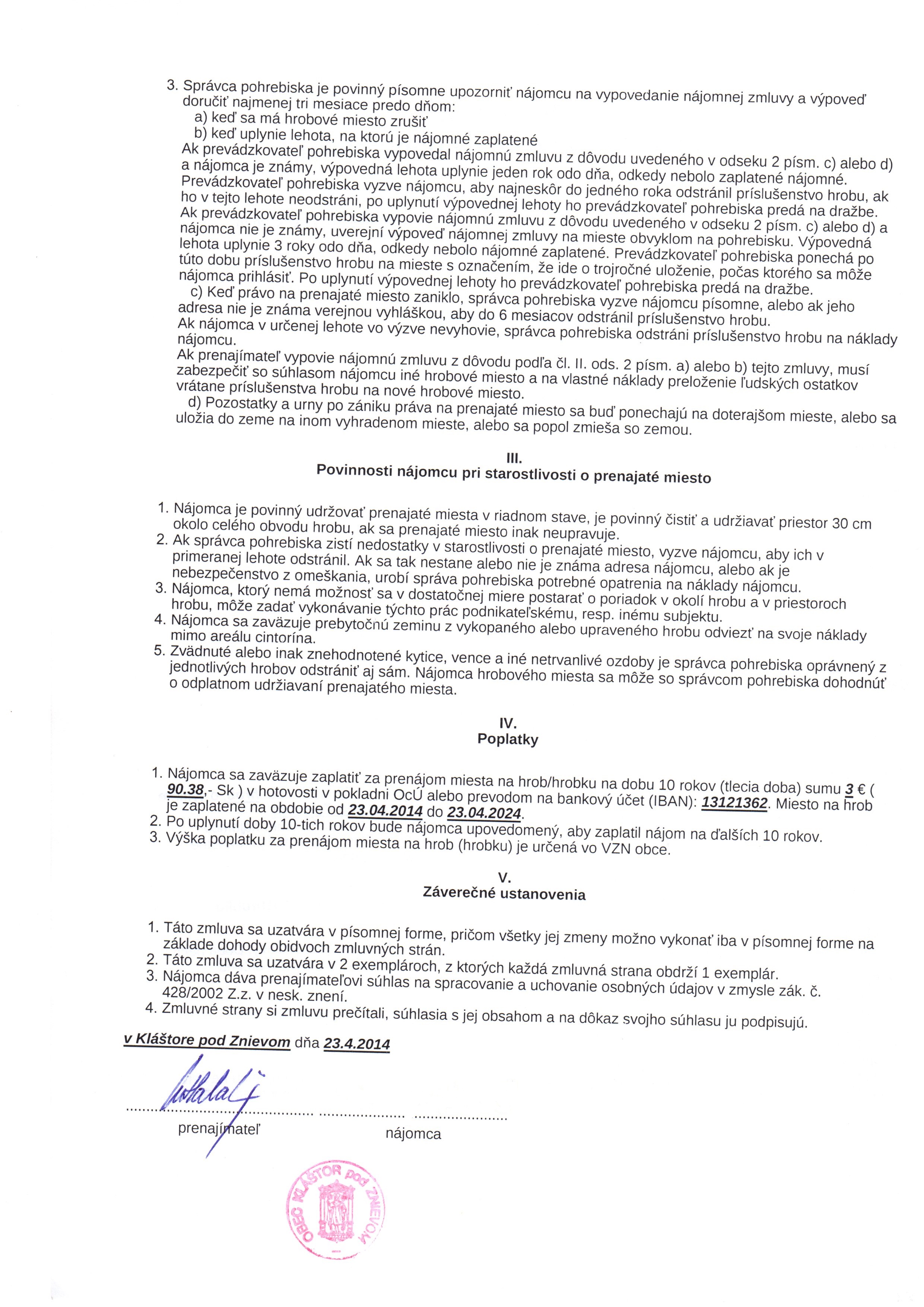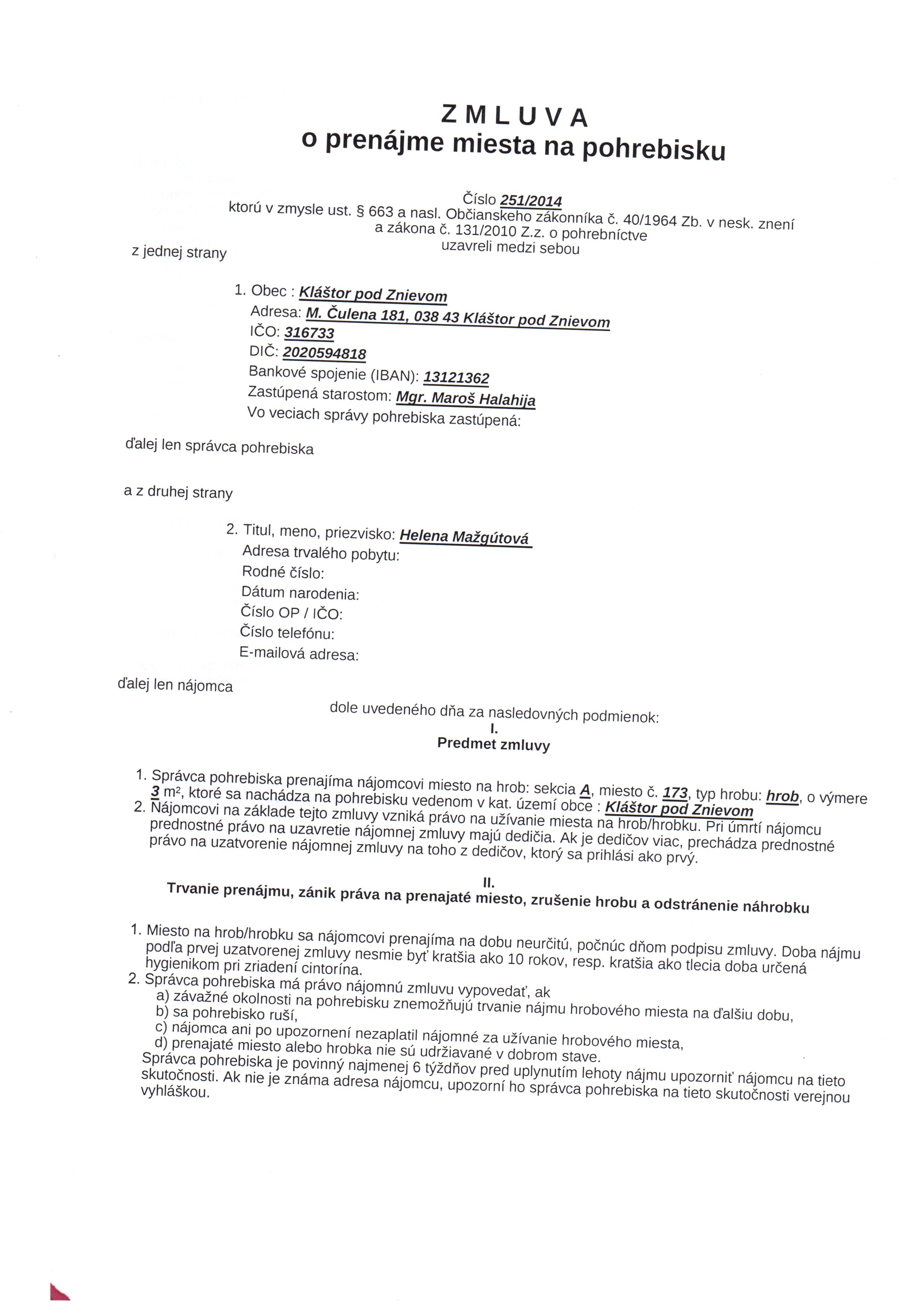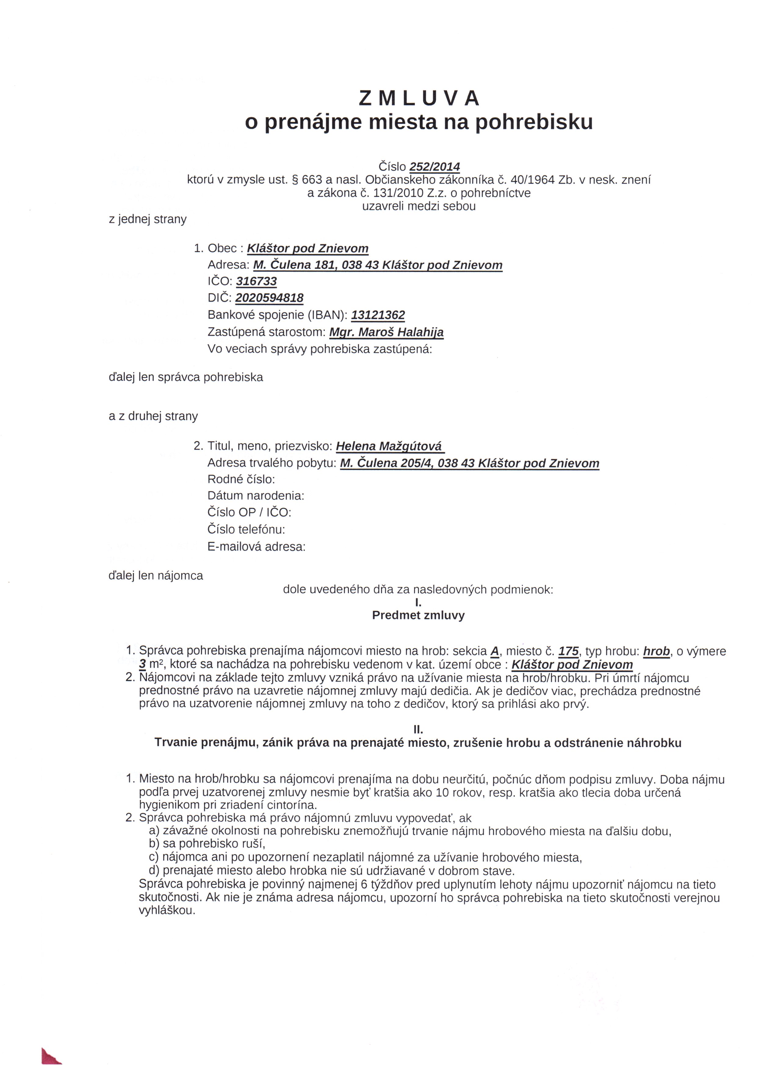 | Názov: | Zmluva o prenájme miesta na pohrebisku |