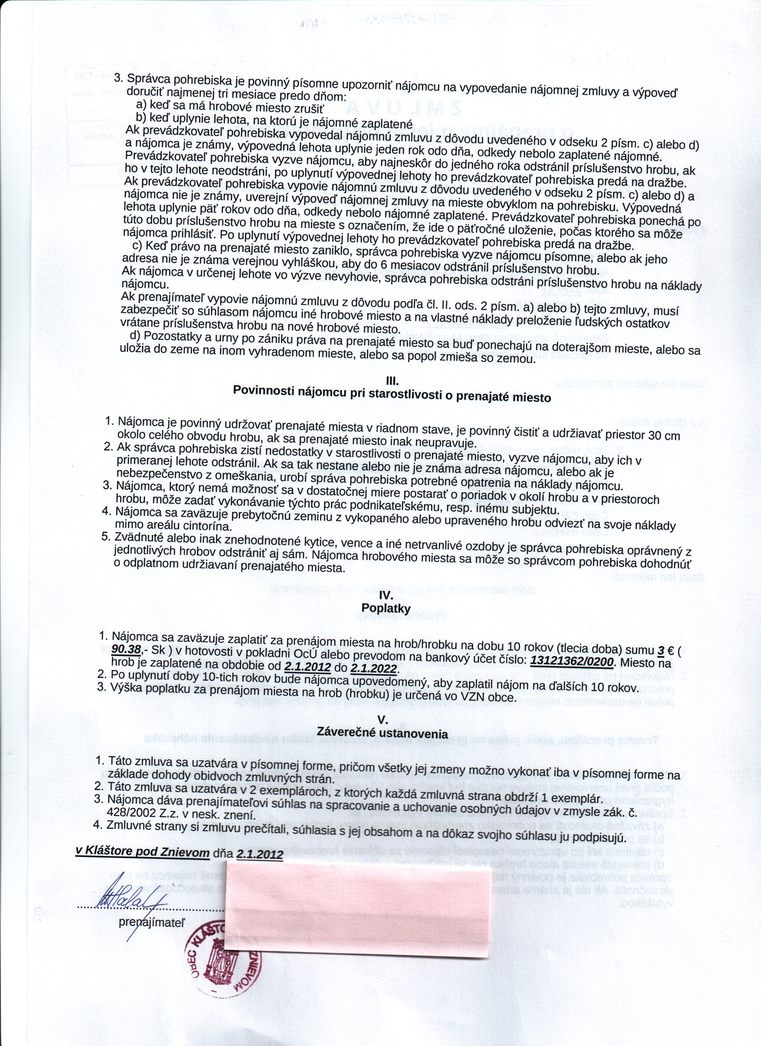 | Názov: | Zmluva o prenájme miesta na pohrebisku |