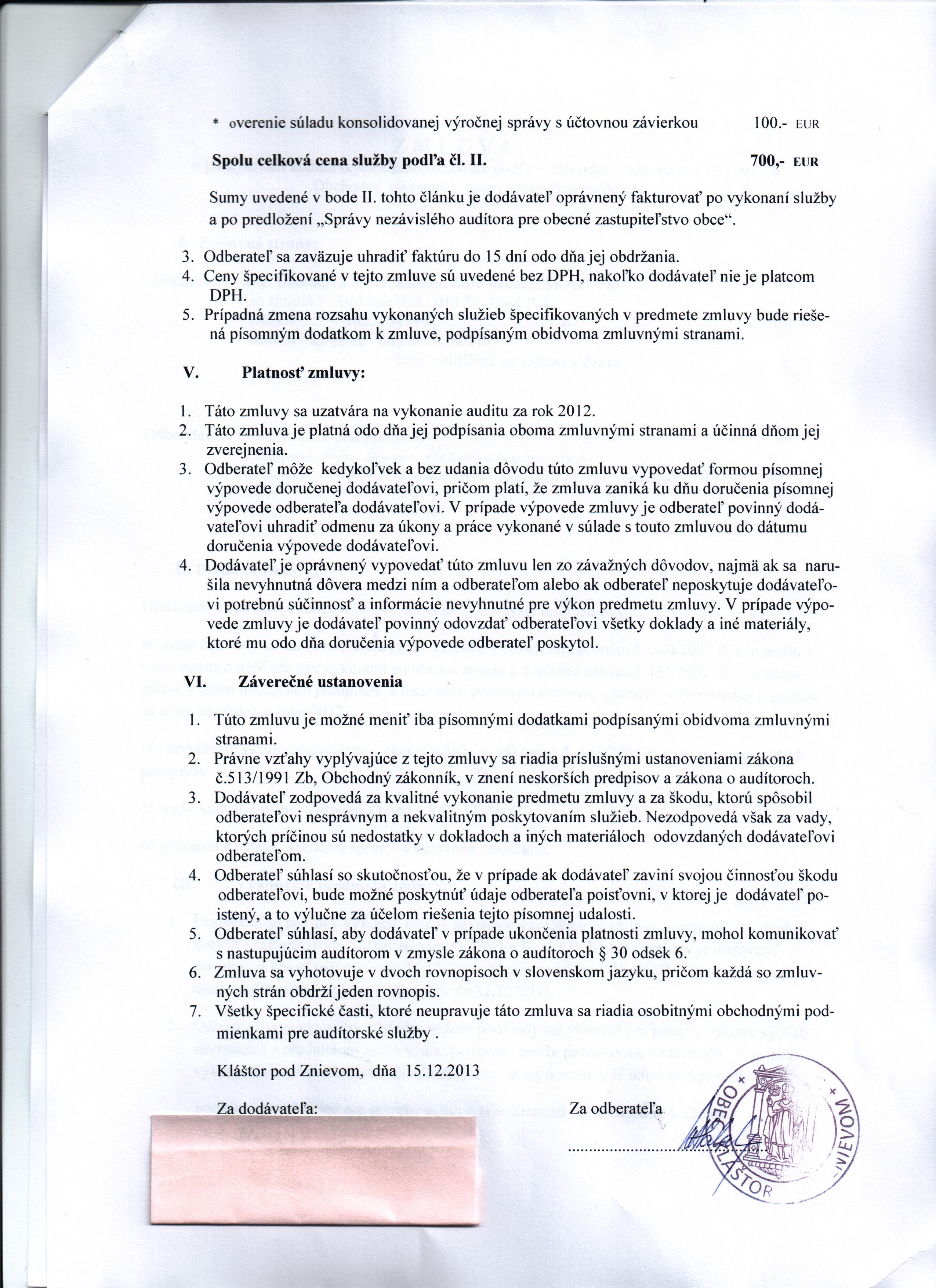| 54/2011 | Obec Kláštor pod Znievom | Zmluva | 300,00 € | 9.1.2011 | nestanovený | |