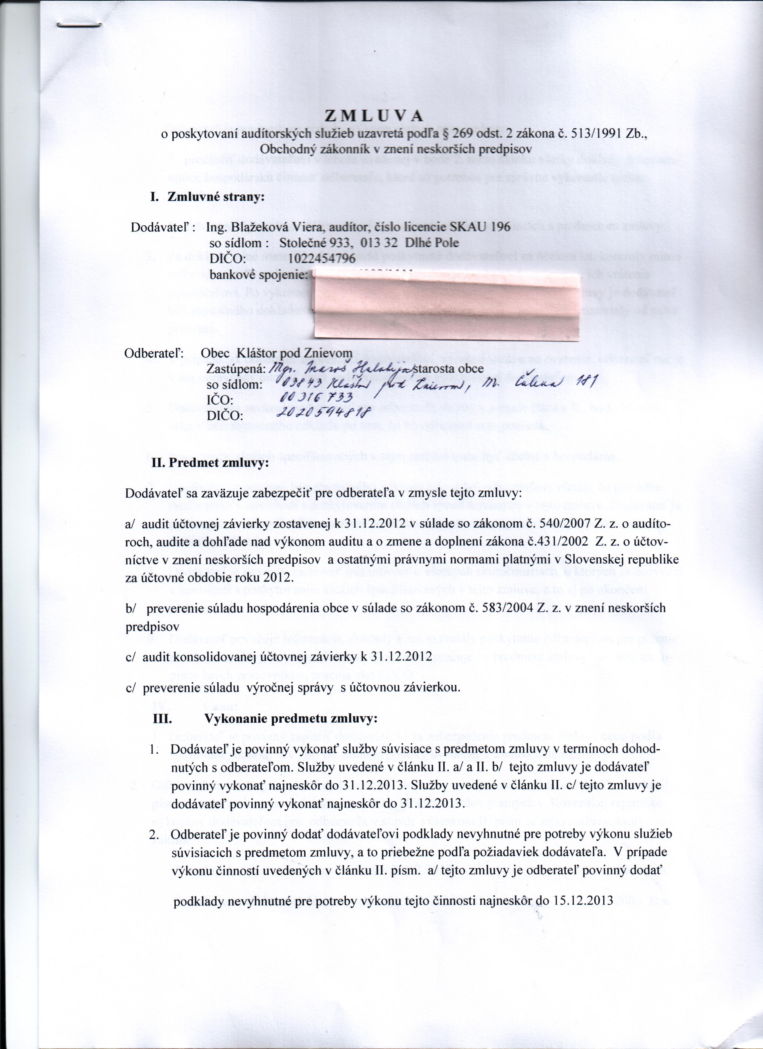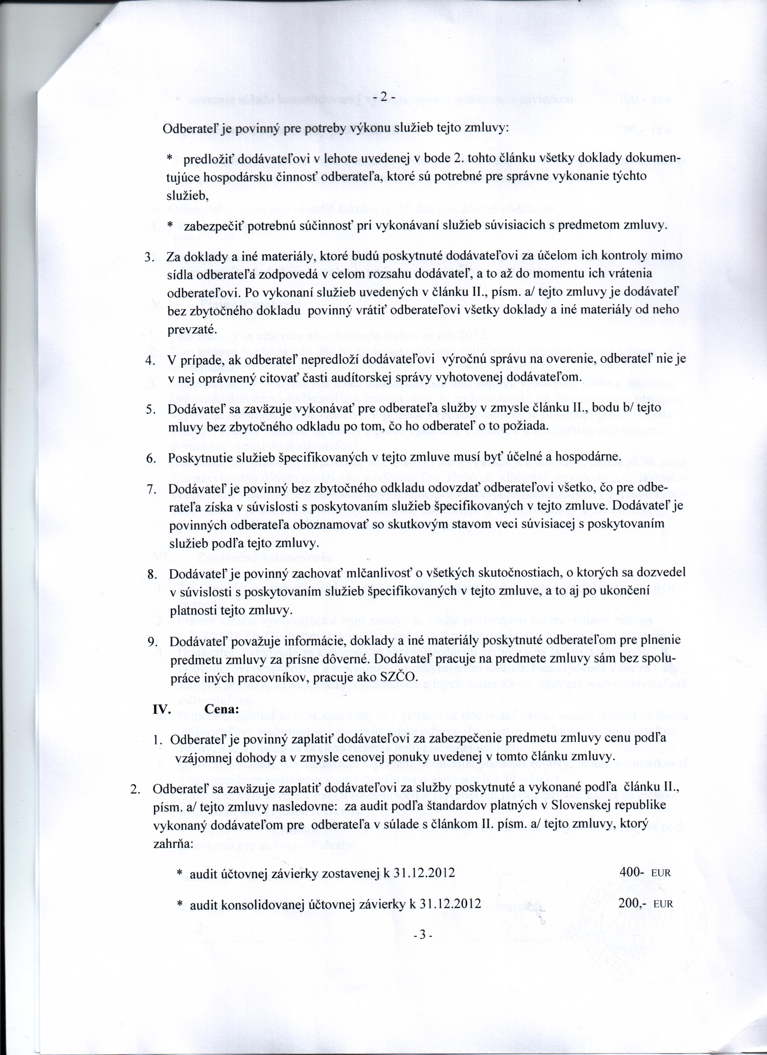 | 1110/2015 | Ing. Jozef Adamkovič - zodpovedný auditor | Zmluva o poskytovaní auditorských služieb | Zabezpečenie auditu účtovnej závierky, výročnej správy... | 2 000,00 € | 30.12.2015 | 20.12.2016 |