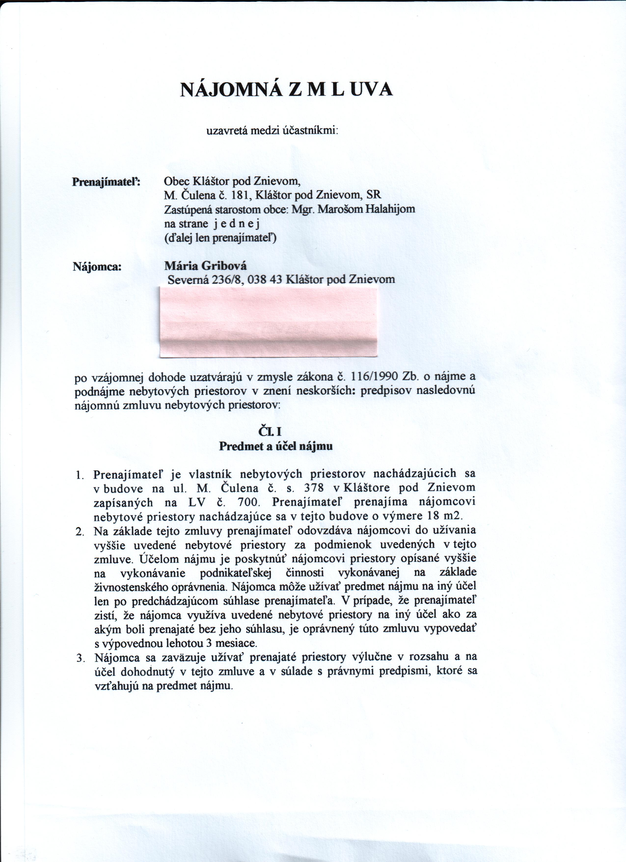 2/2011Obec Kláštor pod ZnievomZmluva o nájme nebytových priestorov0,00 €30.6.2011nestanovený
