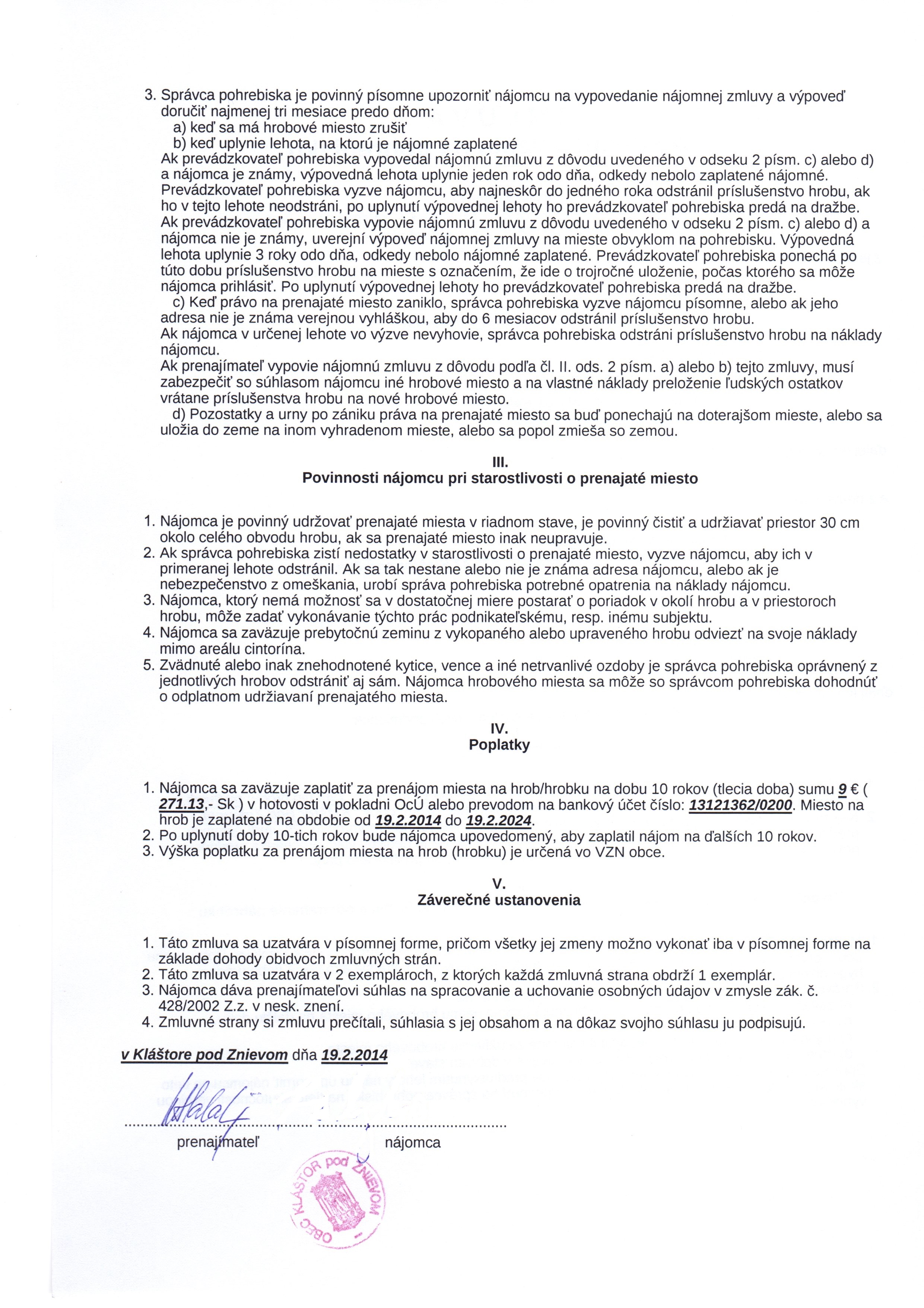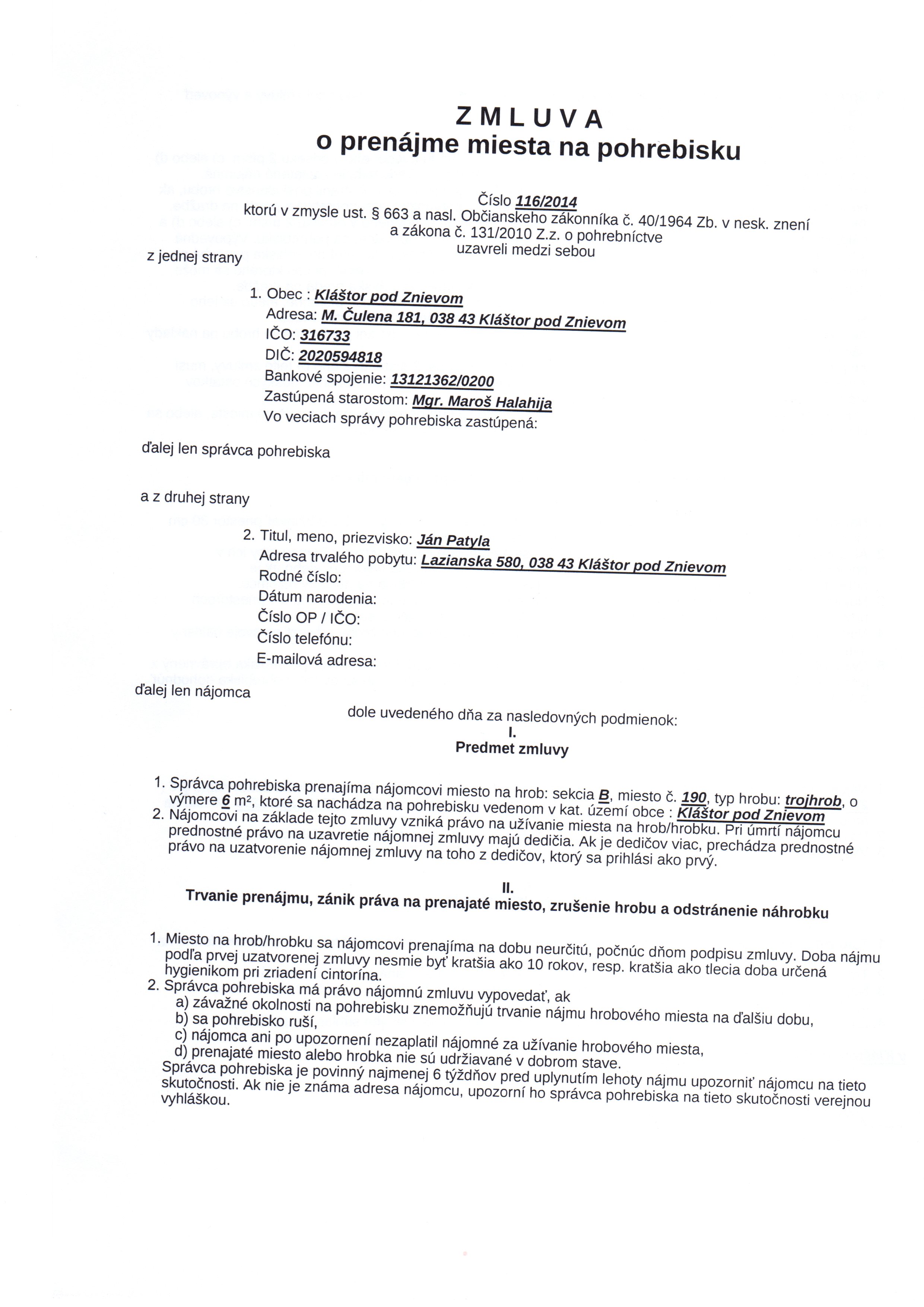 | Názov: | Zmluva o prenájme miesta na pohrebisku |
