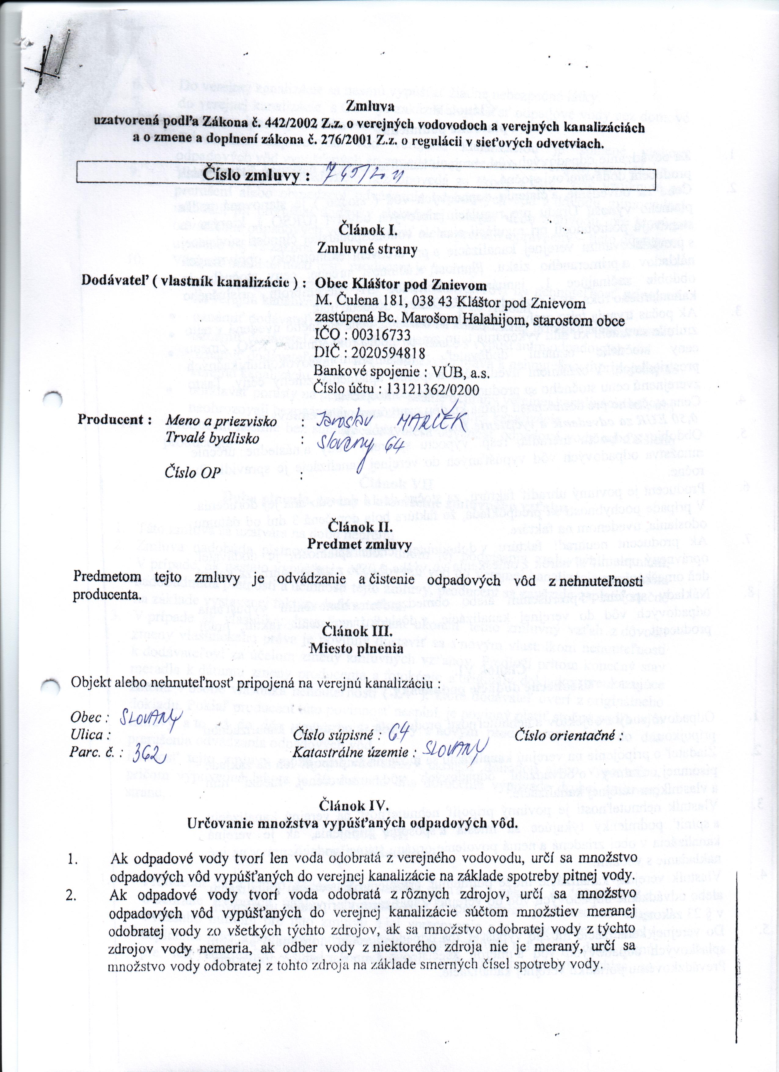 417/2013Obec Kláštor pod ZnievomZmluva o verejných vodovodoch a verejných kanalizáciach 0,00 €5.12.2013nestanovený