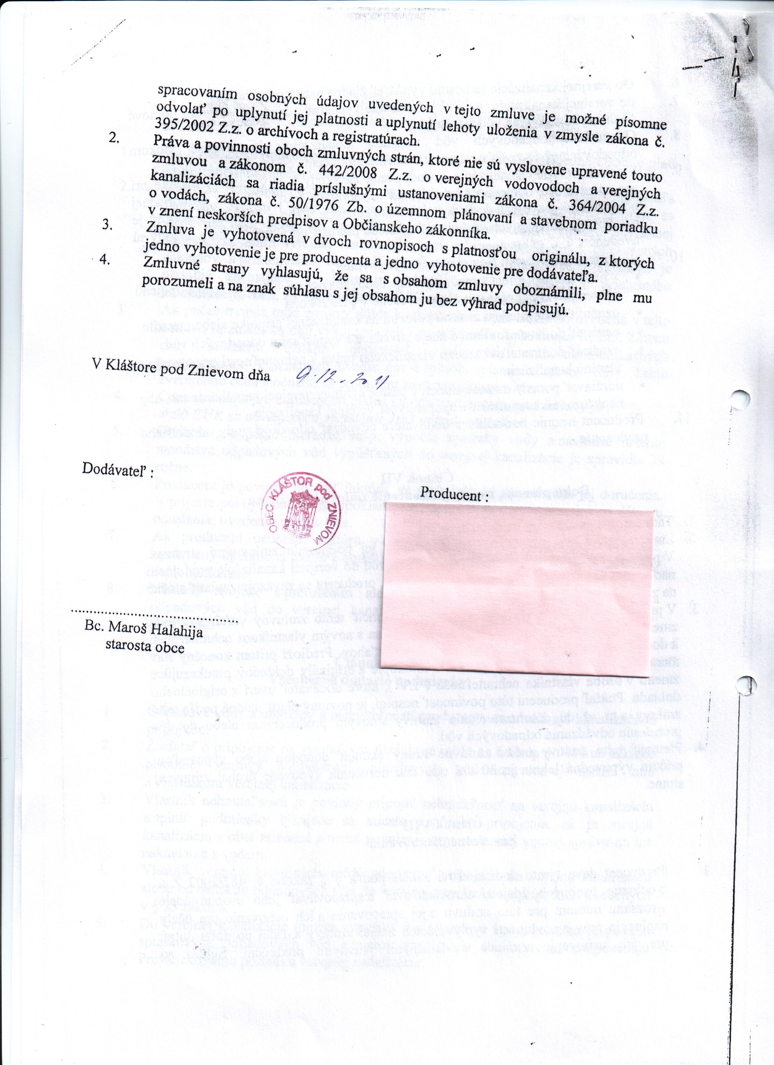 | Zmluvná strana 2: | Obec Kláštor pod Znievom |