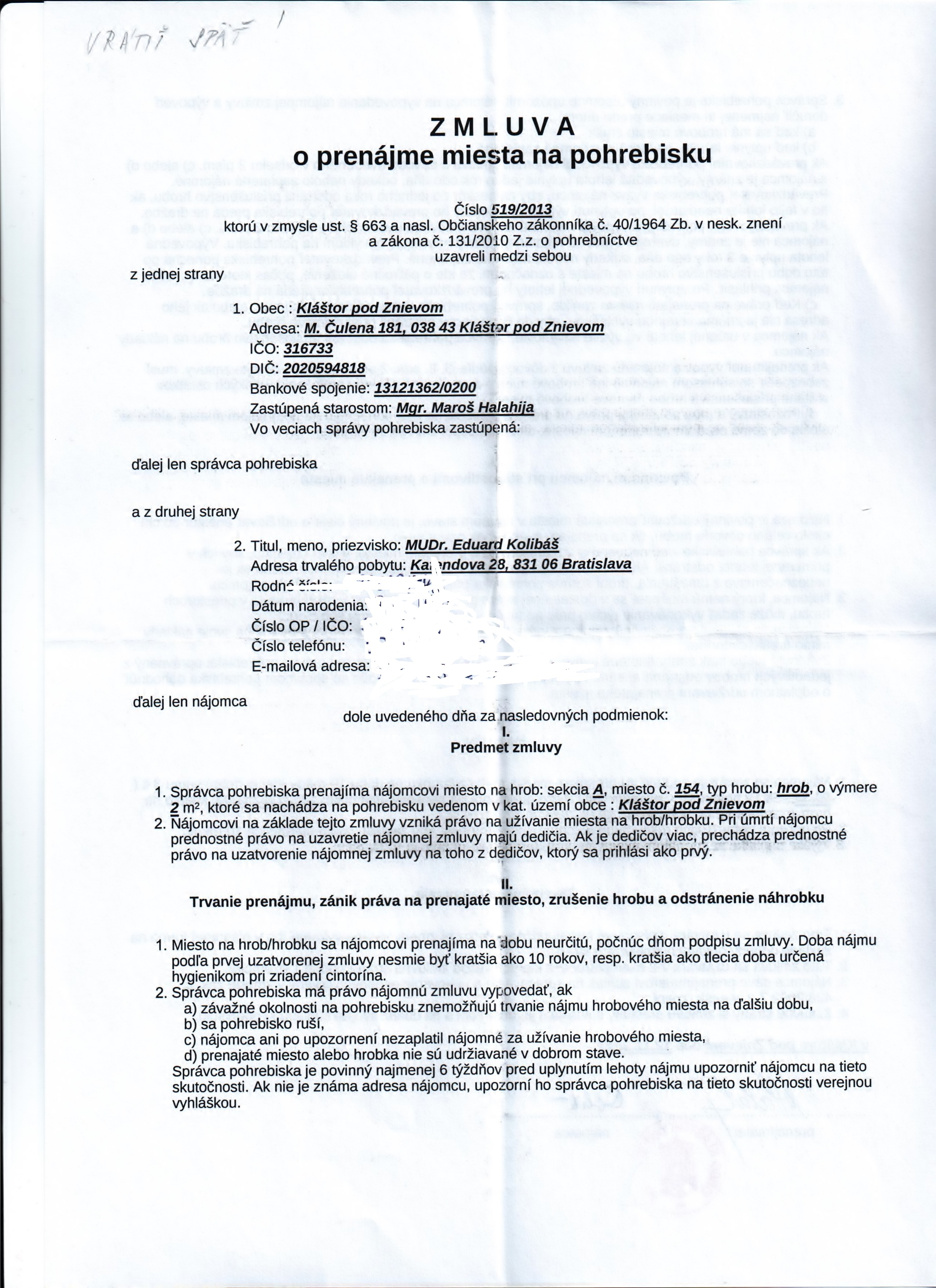| Názov: | Zmluva o prenájme miesta na pohrebisku |