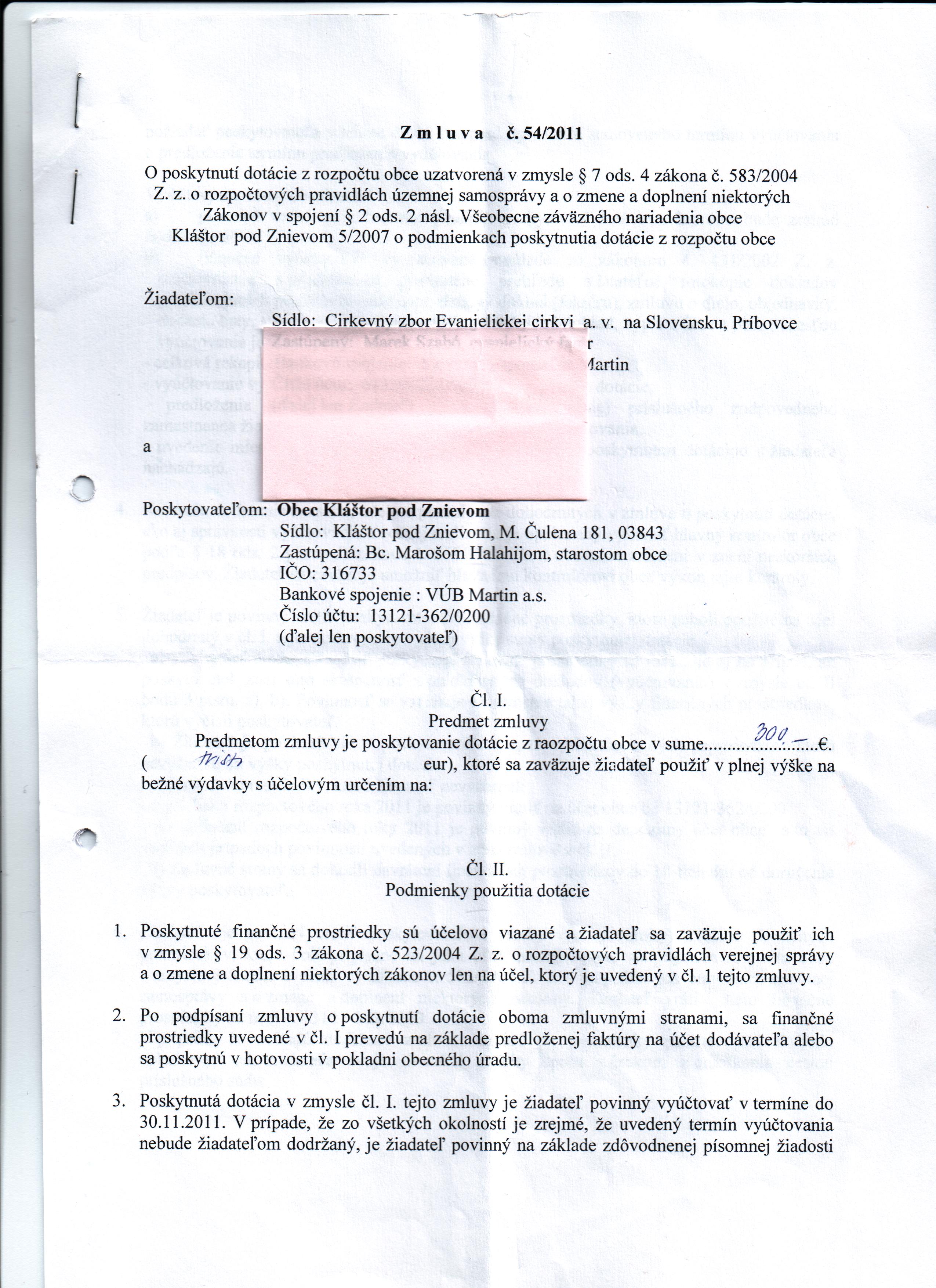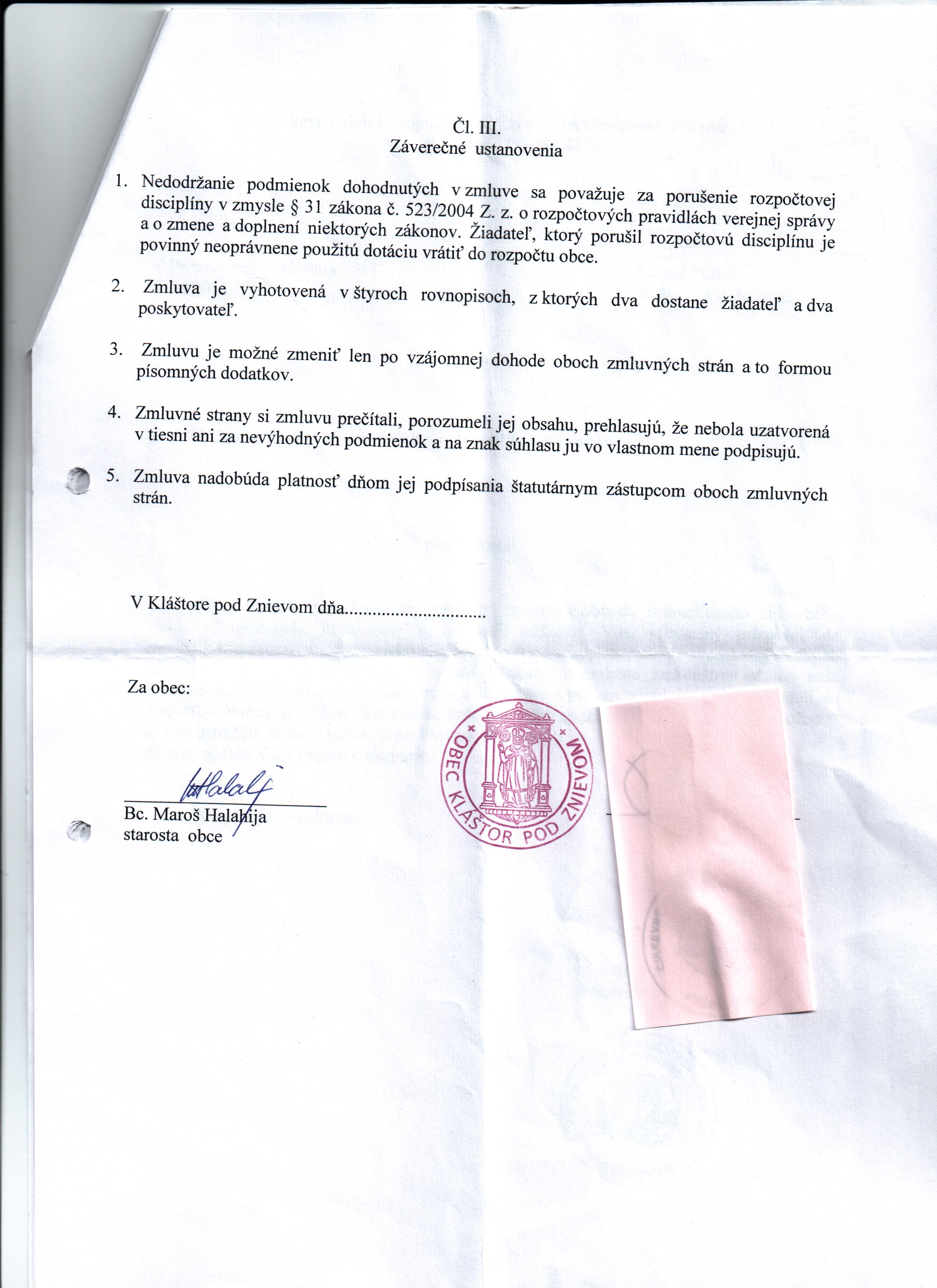 | Zmluvná strana 2: | Obec Kláštor pod Znievom |