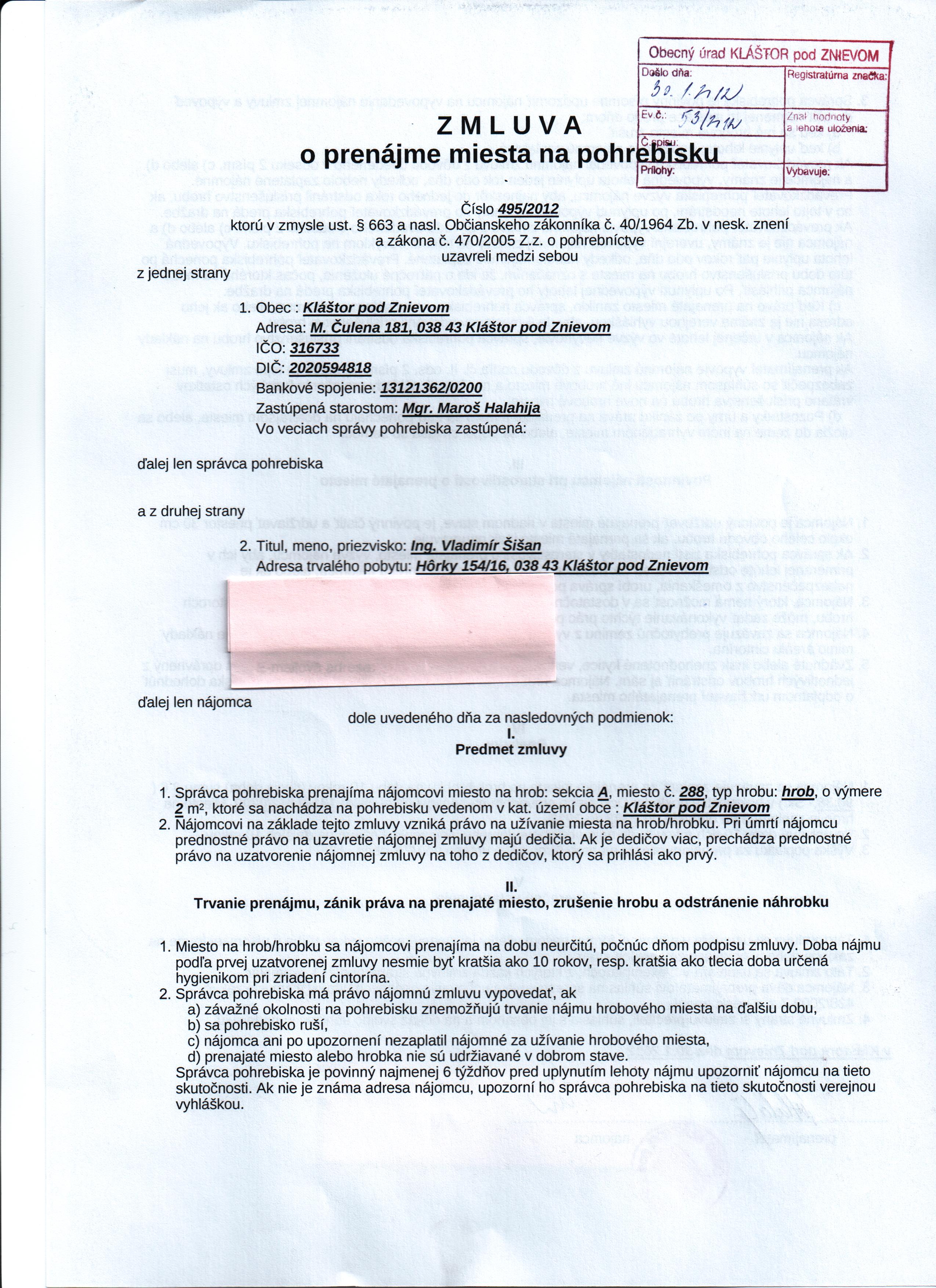 | Názov: | Zmluva o prenájme miesta na pohrebisku |