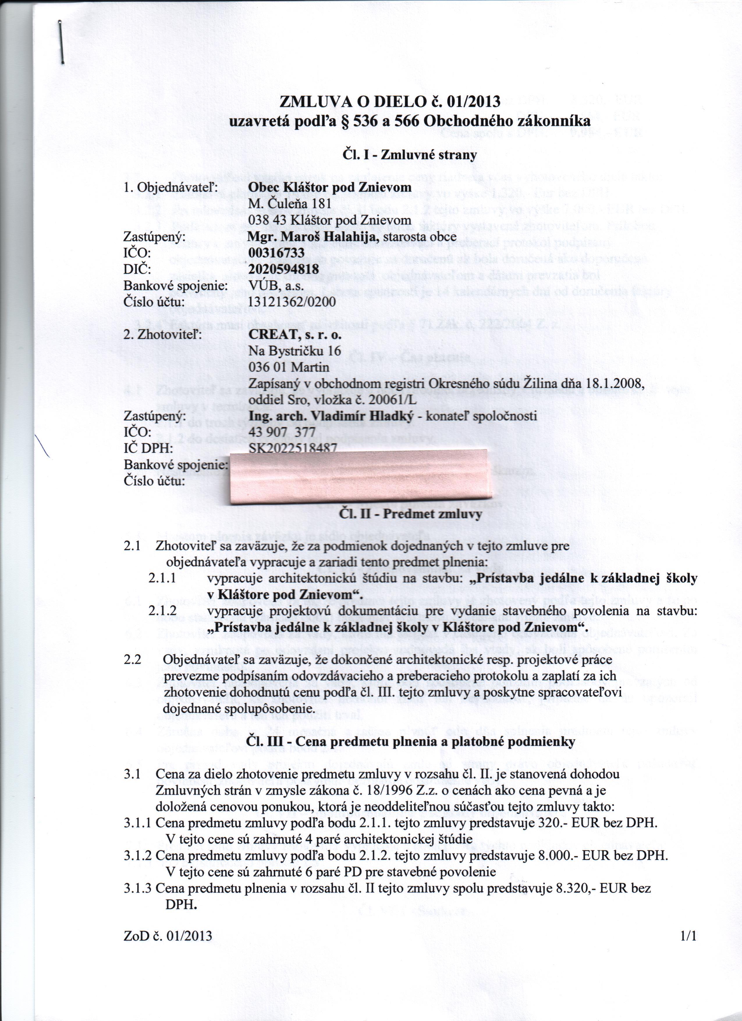 | D1/02/2016 | Ing. arch. Vladimír Hladký - CREAT | Dodatok č. 1 k Zmluve o dielo č. 02/2016 | Zhotoviteľ sa zaväzuje vypracovať projektovú dokumentáciu pre stavebné povolenie na realizáciu stavby Zateplenie administratívnej budovy. | 0,00 € | 19.10.2017 | nestanovený |