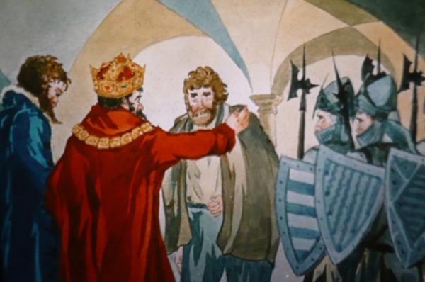 Hradný pán Ondrej sa zveril so svojimi starosťami kráľovi. Obliehanie hradu trvalo dlho, potraviny sa míňali a vojakom ubúdalo síl. Keď to kráľ videl, sám sa vzdal svojho prídelu potravín a povzbudzoval obrancov hradu. Hlad však stále trápi obrancov hradu. Aj zoslabnutý a vyčerpaný kráľ smutno sedel pri stole a rozmýšľal, čo robiť v tejto situácii.
