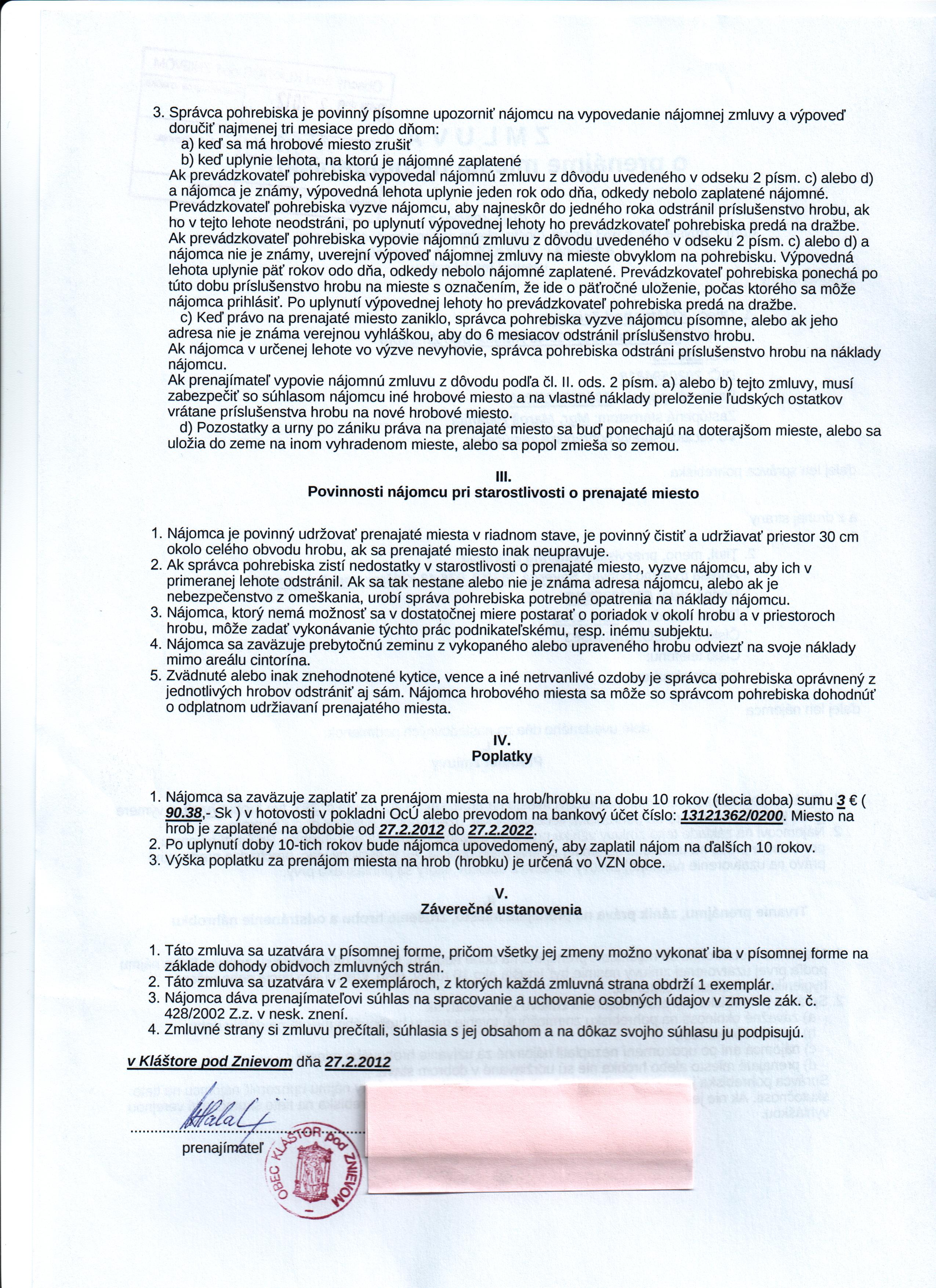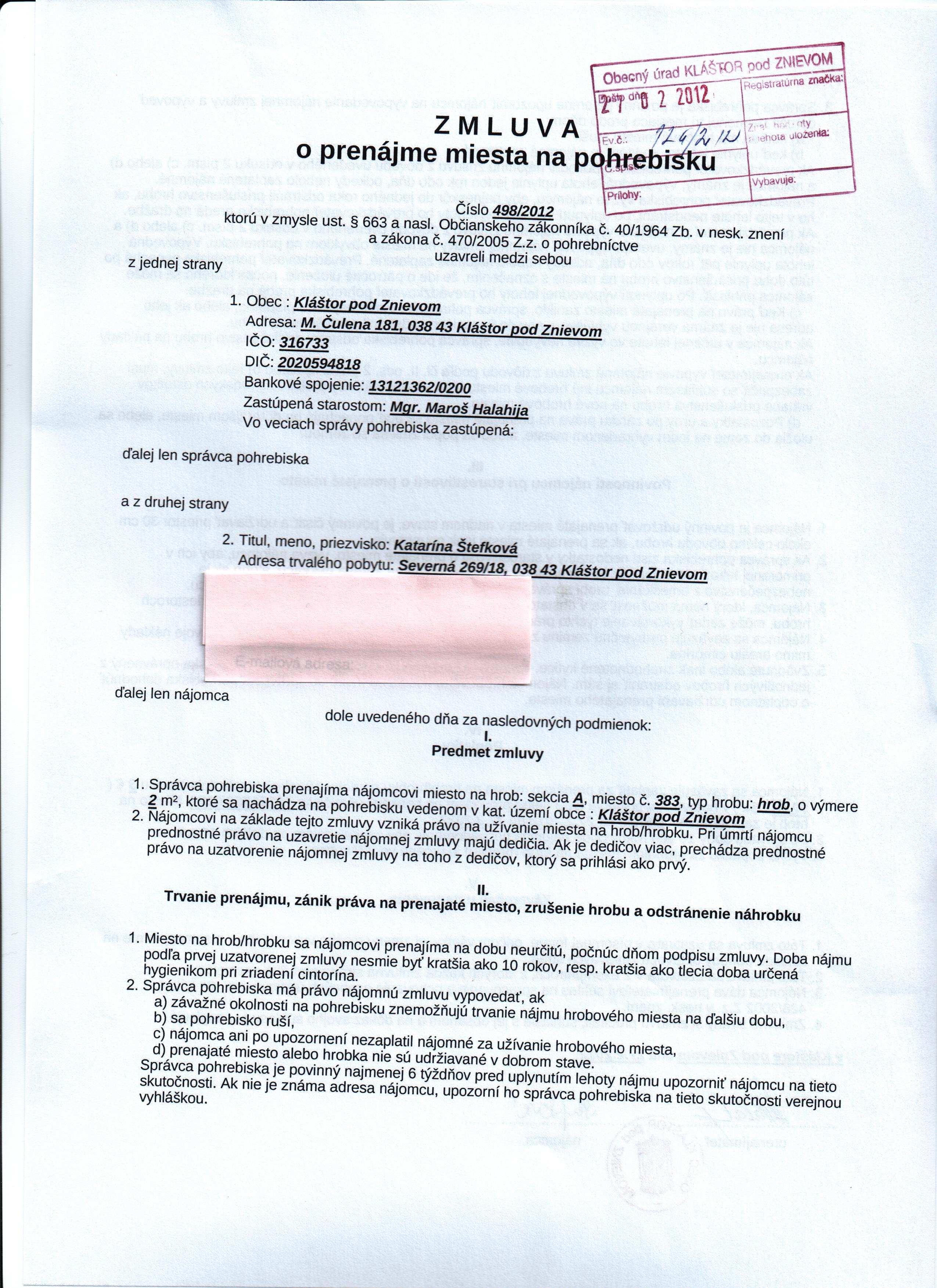 | Názov: | Zmluva o prenájme miesta na pohrebisku |