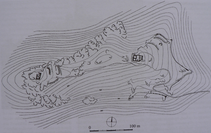 Hradný vrch - vľavo Horný (Starý) hrad, vpravo Dolný (Nový) hrad, dnes zrúcaniny.