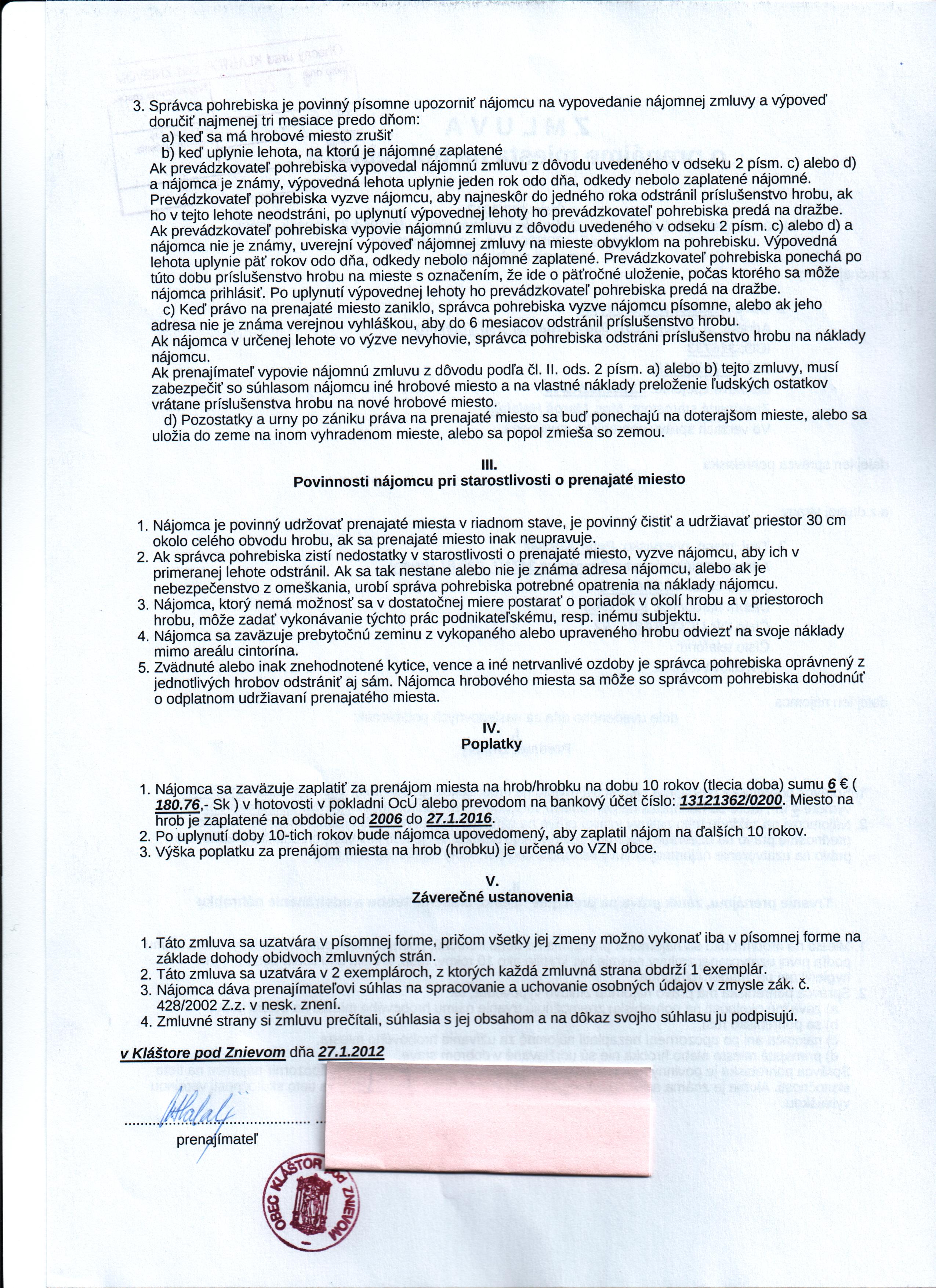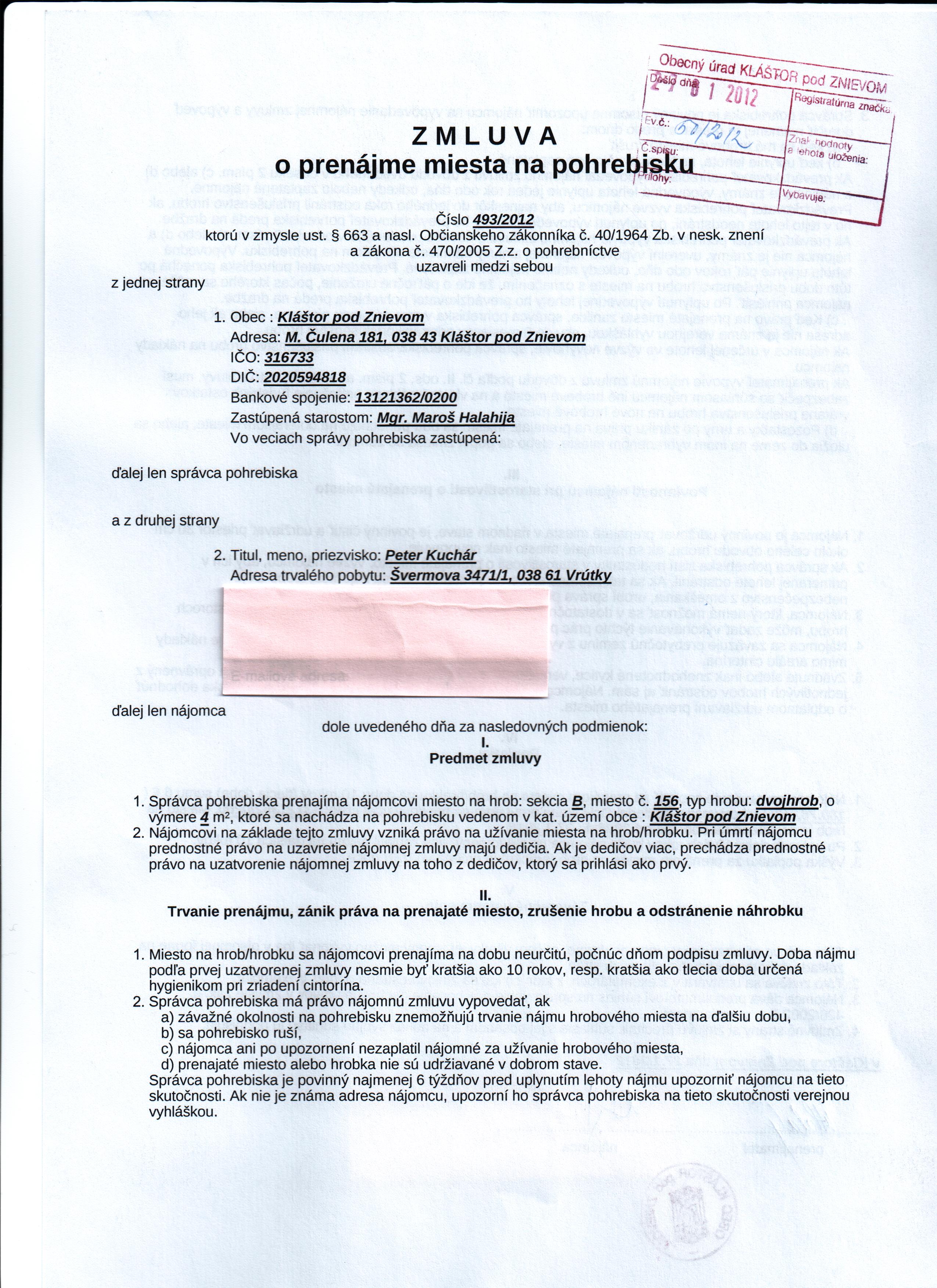 | Názov: | Zmluva o prenájme miesta na pohrebisku |