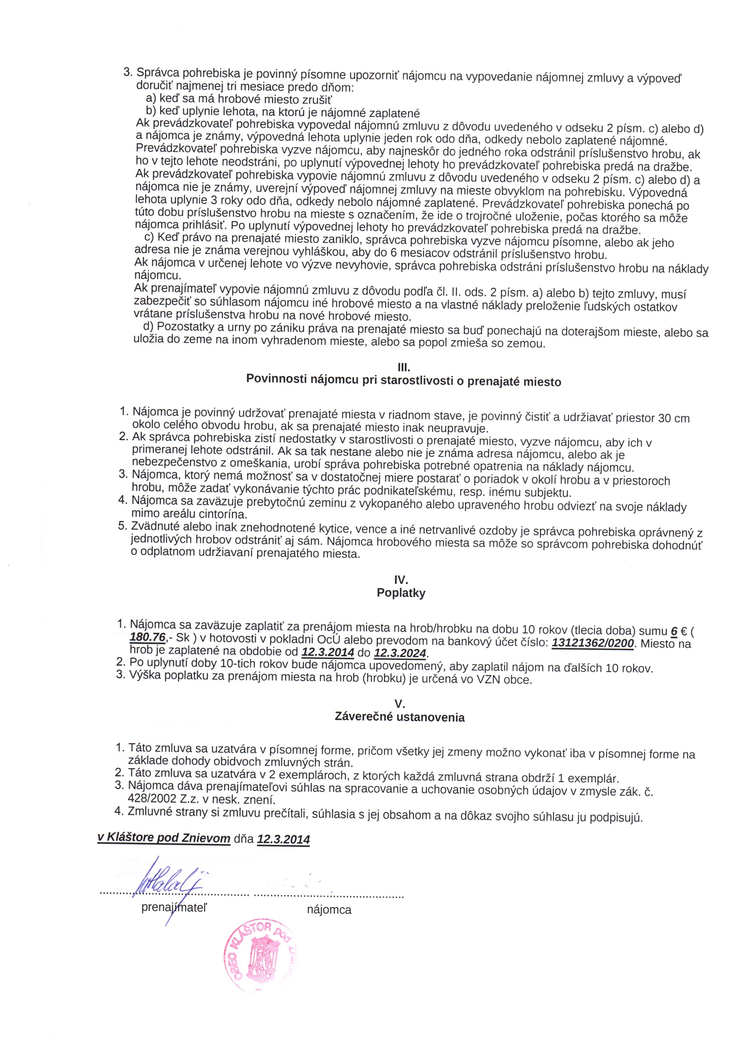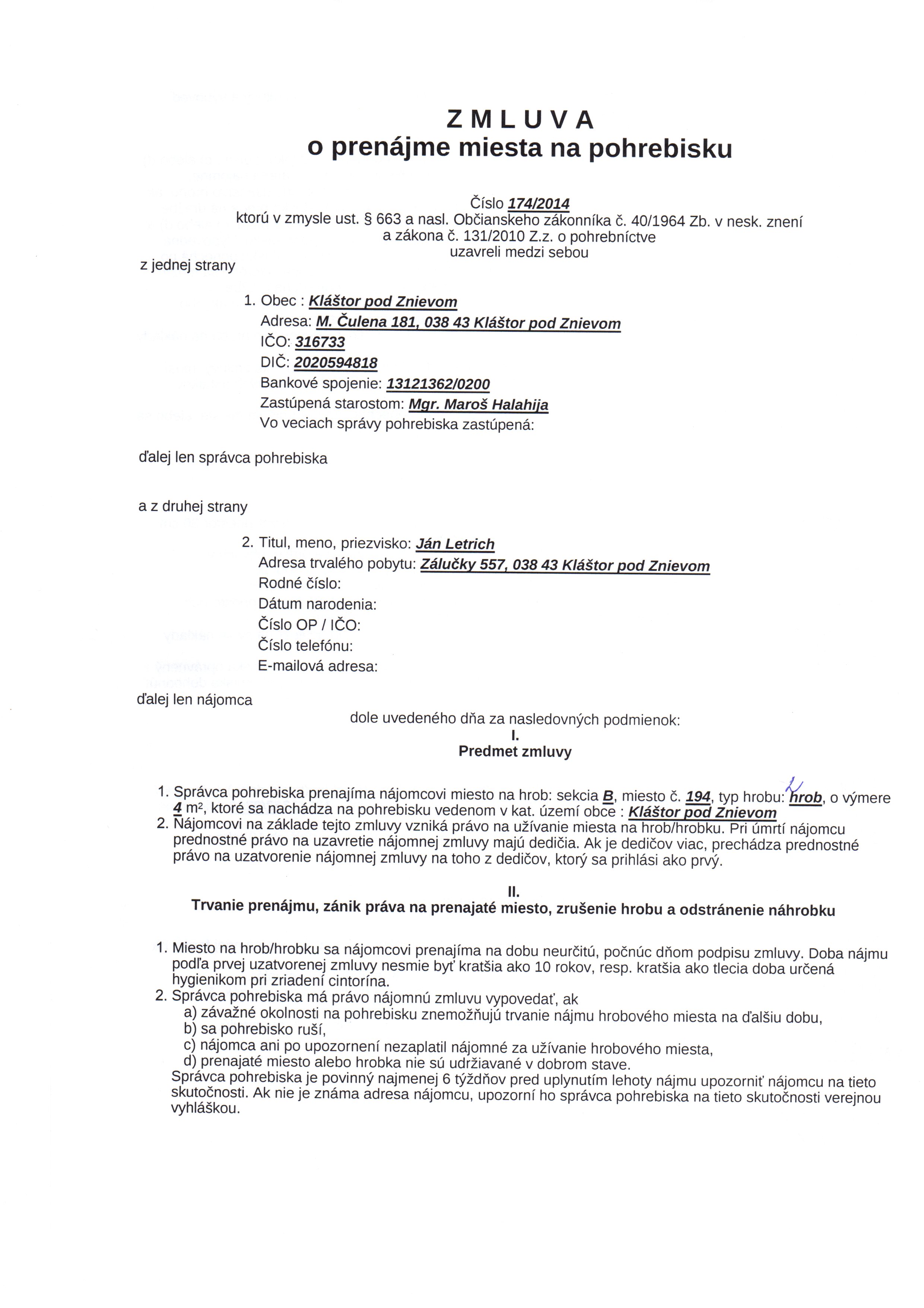 | Názov: | Zmluva o prenájme miesta na pohrebisku |
