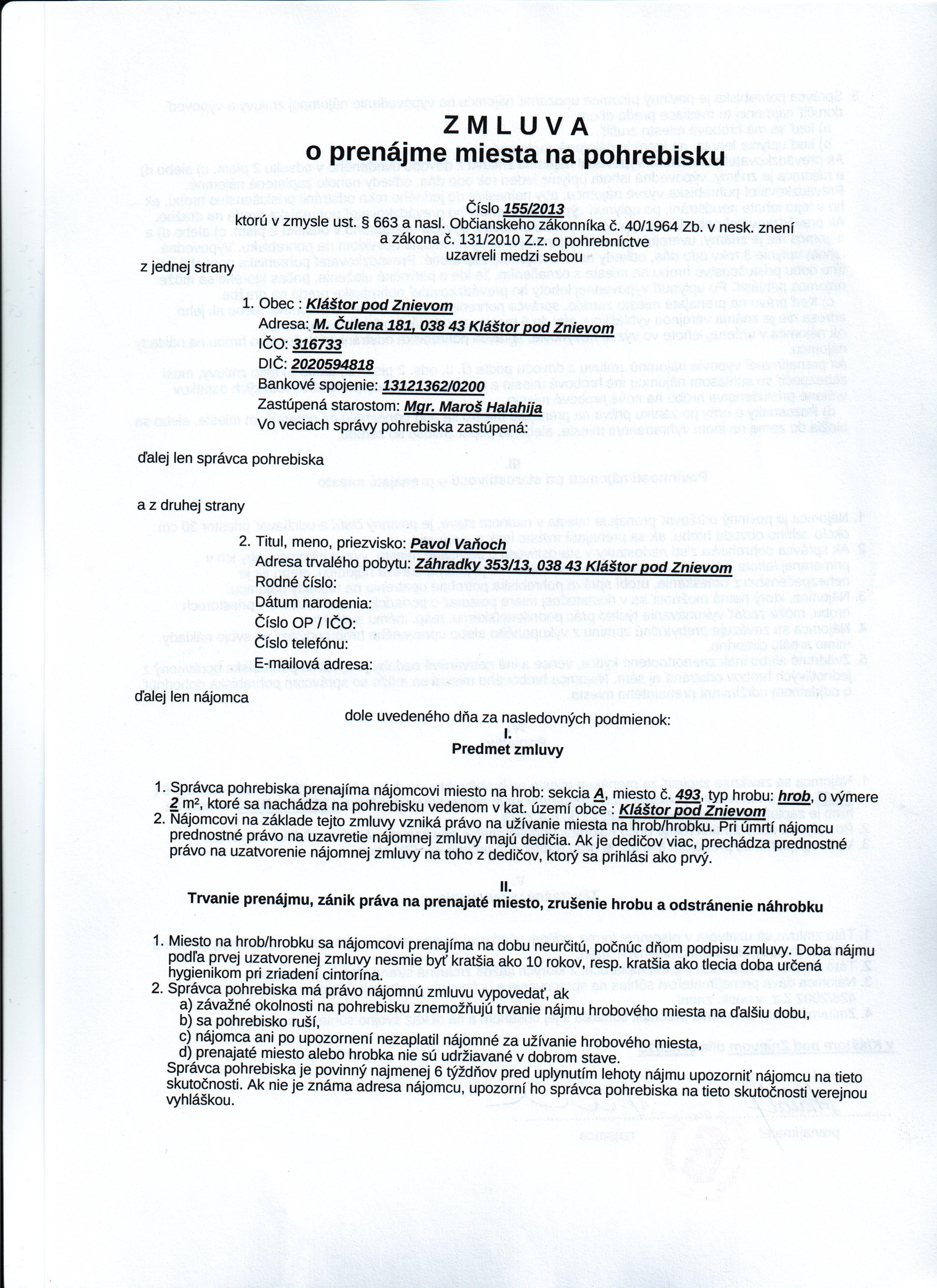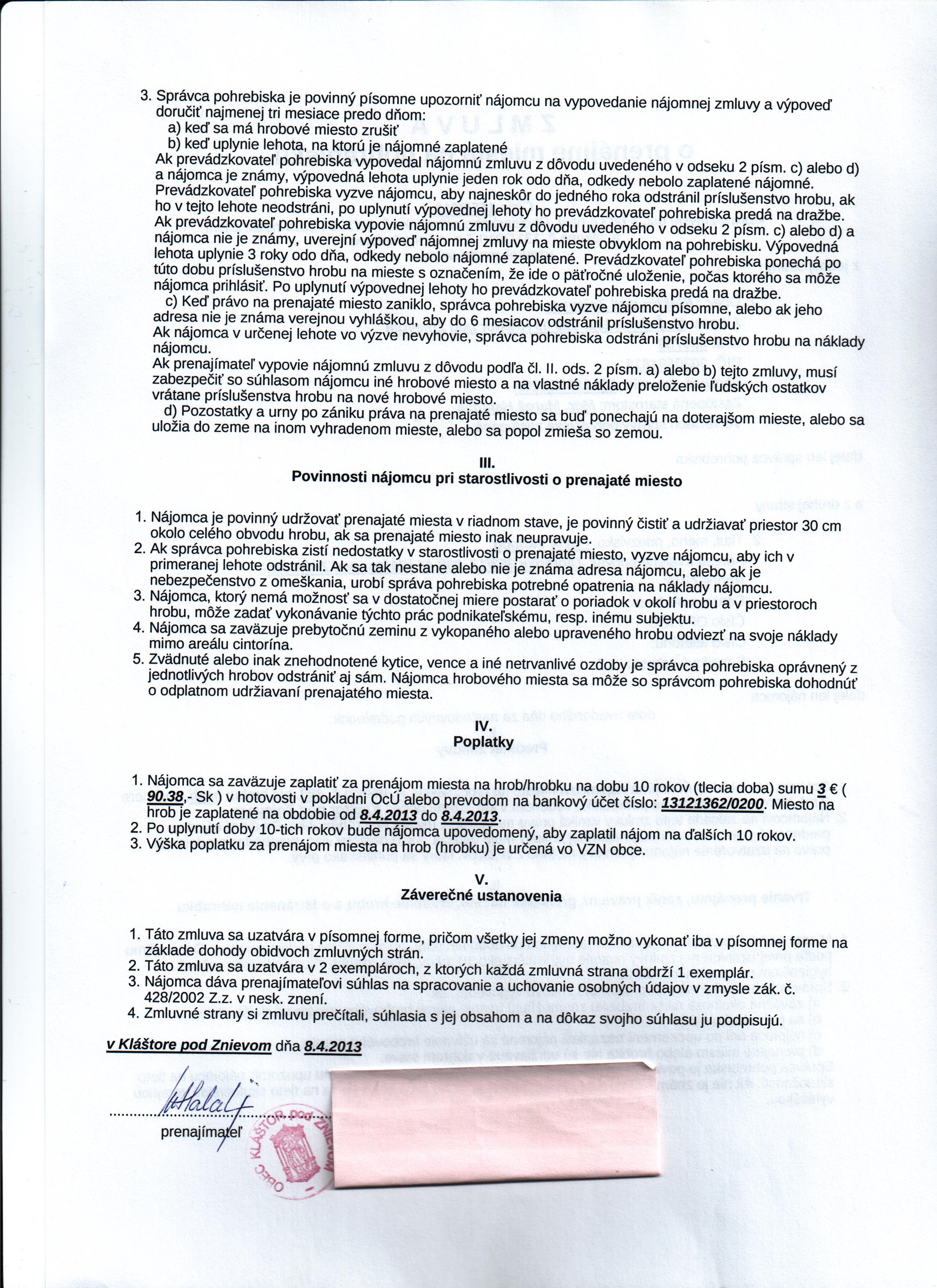 | Názov: | Zmluva o prenájme miesta na pohrebisku |