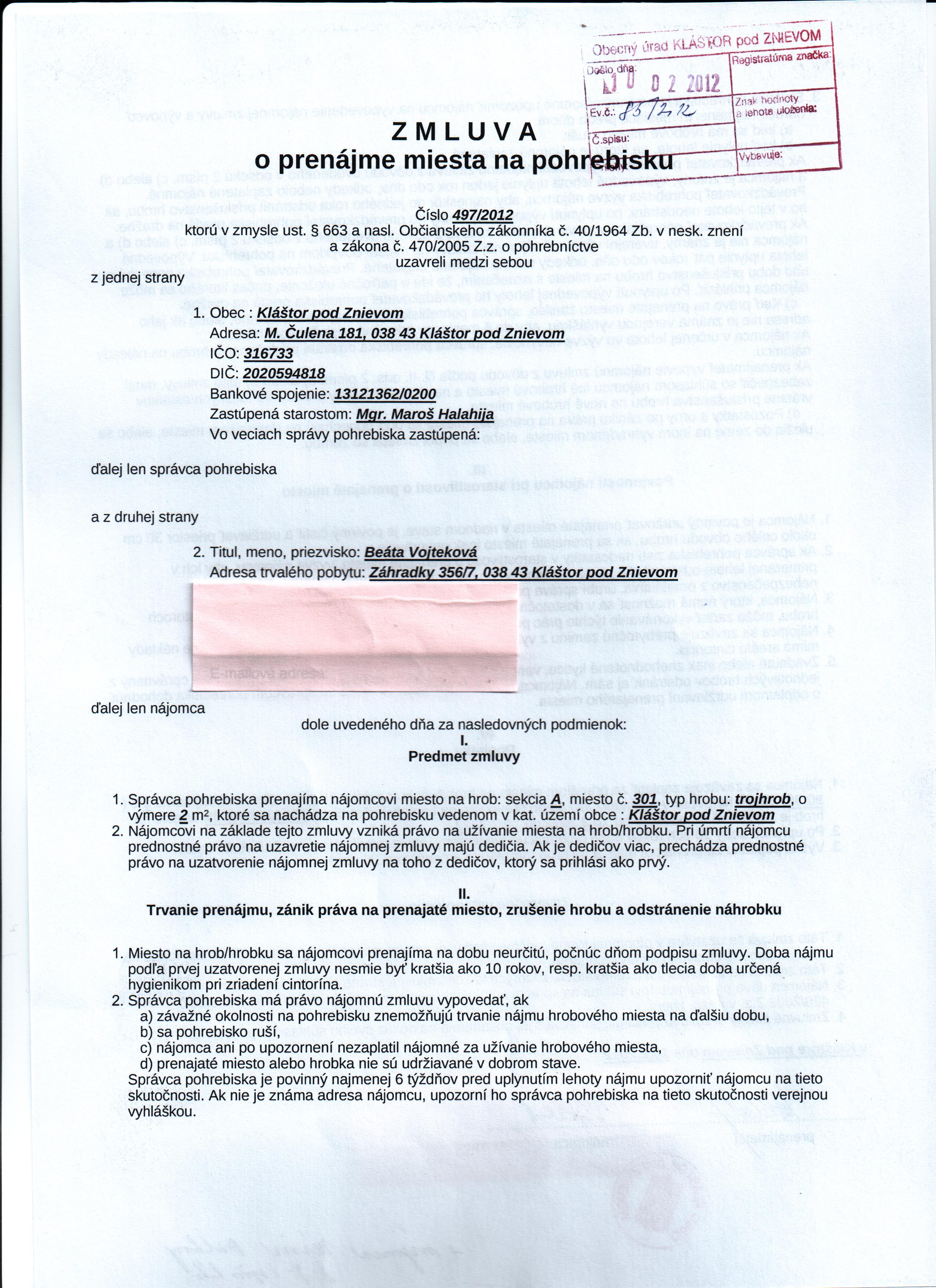 | Názov: | Zmluva o prenájme miesta na pohrebisku |