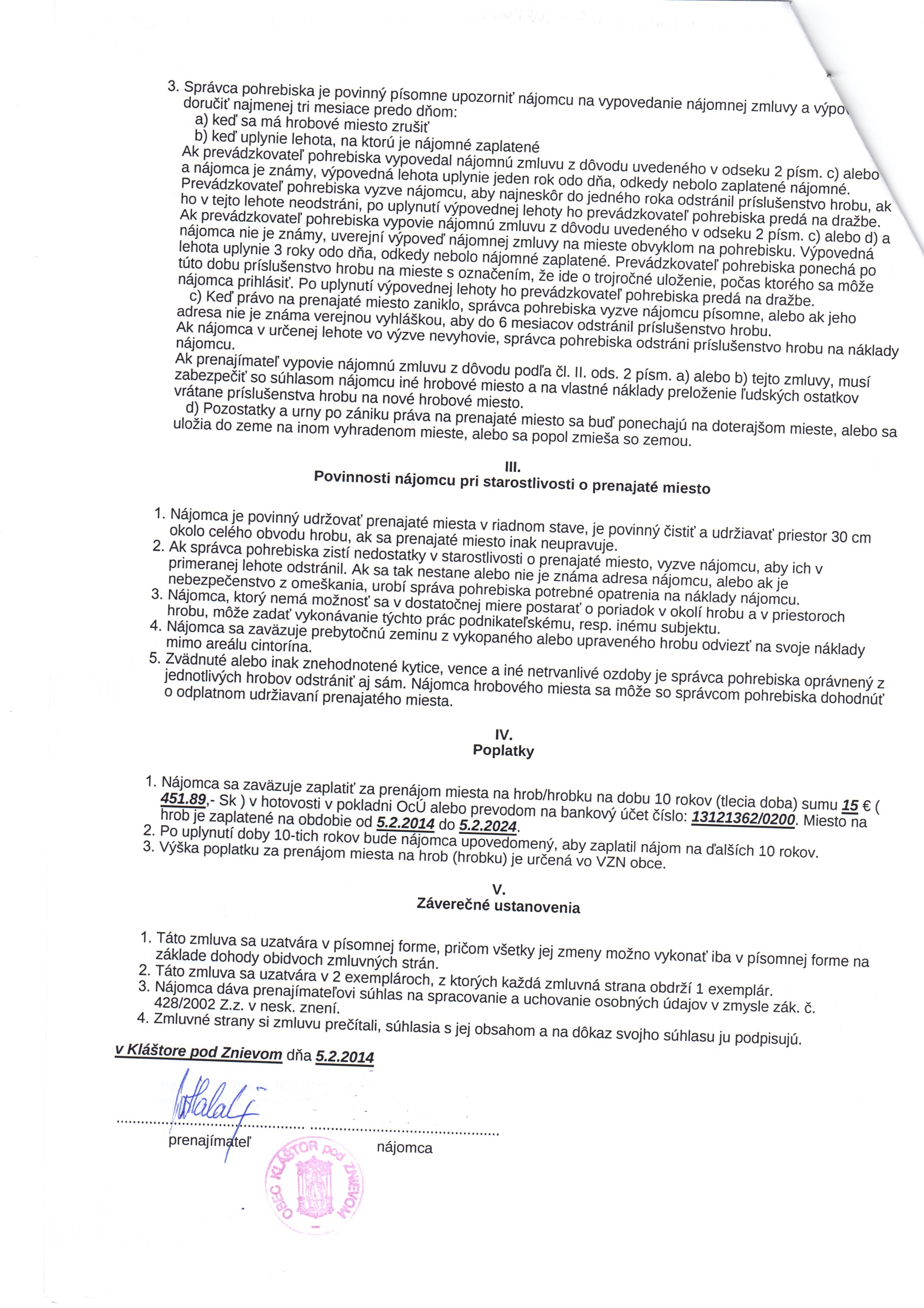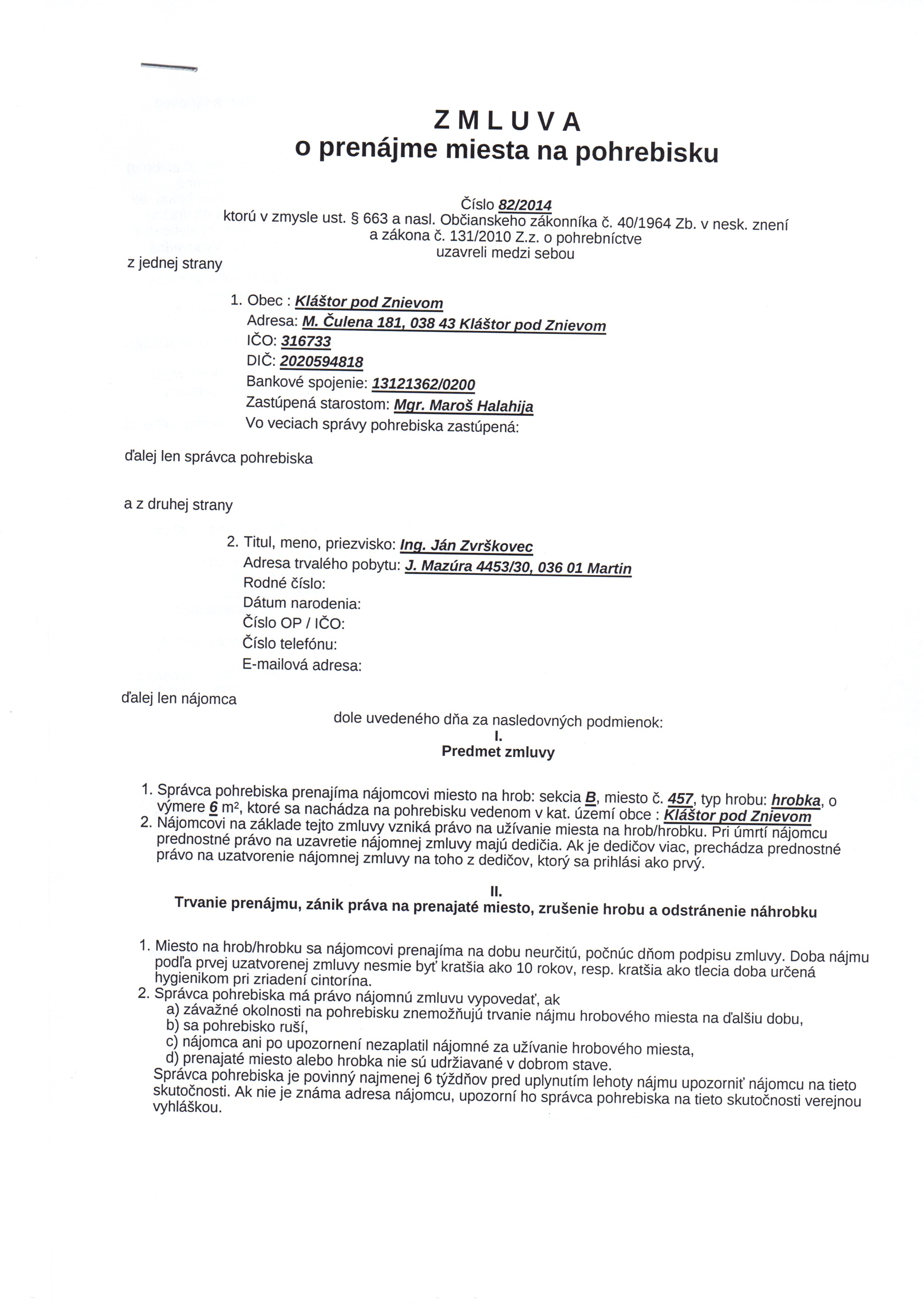 | Názov: | Zmluva o prenájme miesta na pohrebisku |