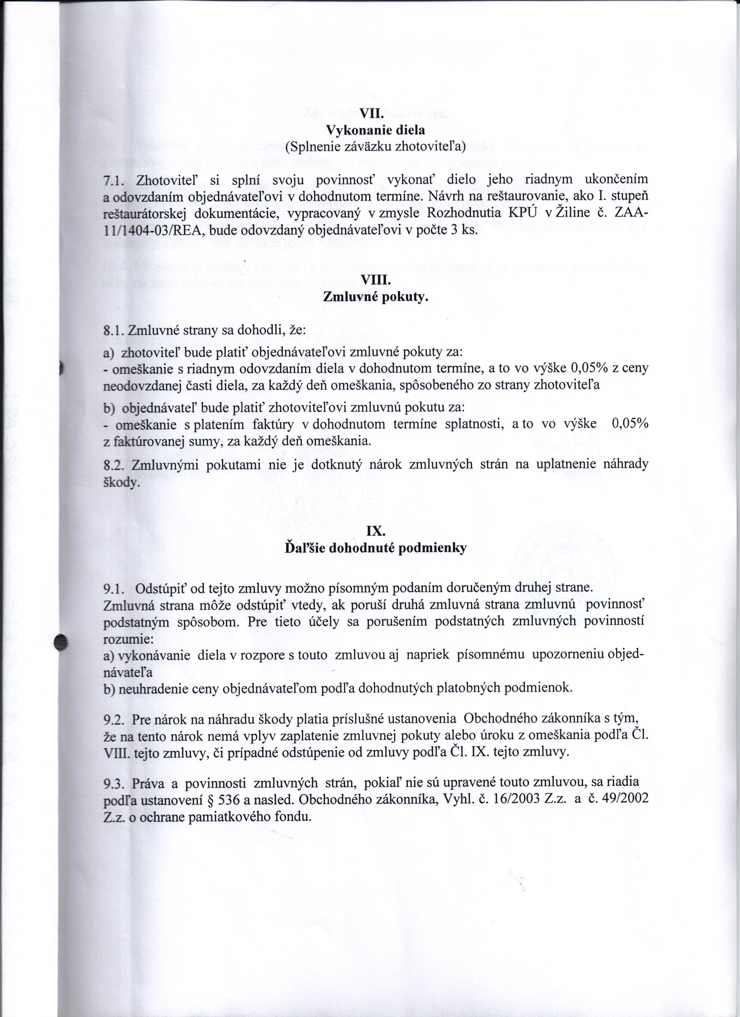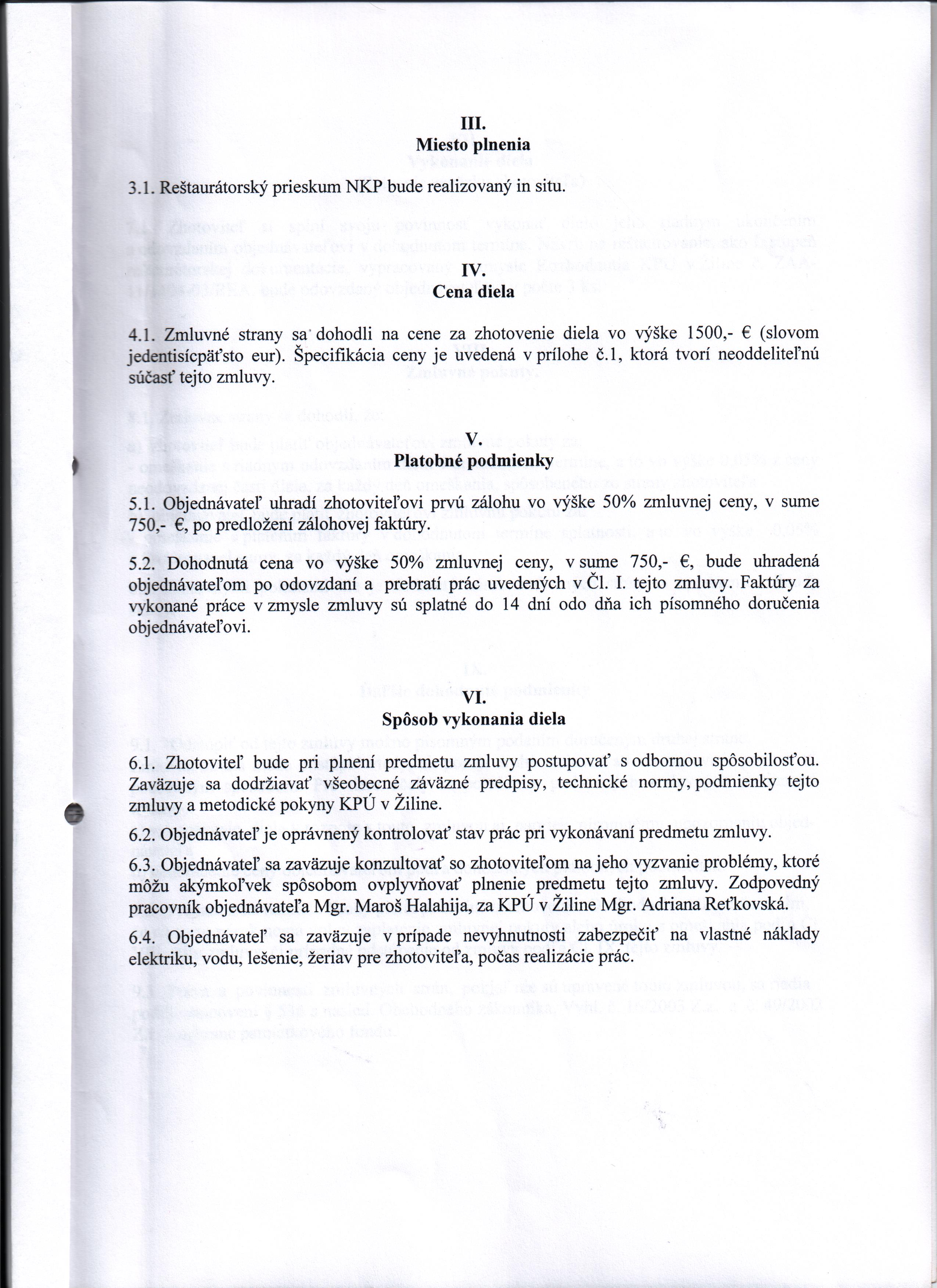 | 7/2017 | Mgr. art. Tomáš Ovsianka | Zmluva o dielo | vykonanie odborných reštaurátorských prác na NKP: 4. etapa - záverečná, reštaurovanie NKP, spiatočná montáž | 6 600,00 € | 10.10.2017 | nestanovený |