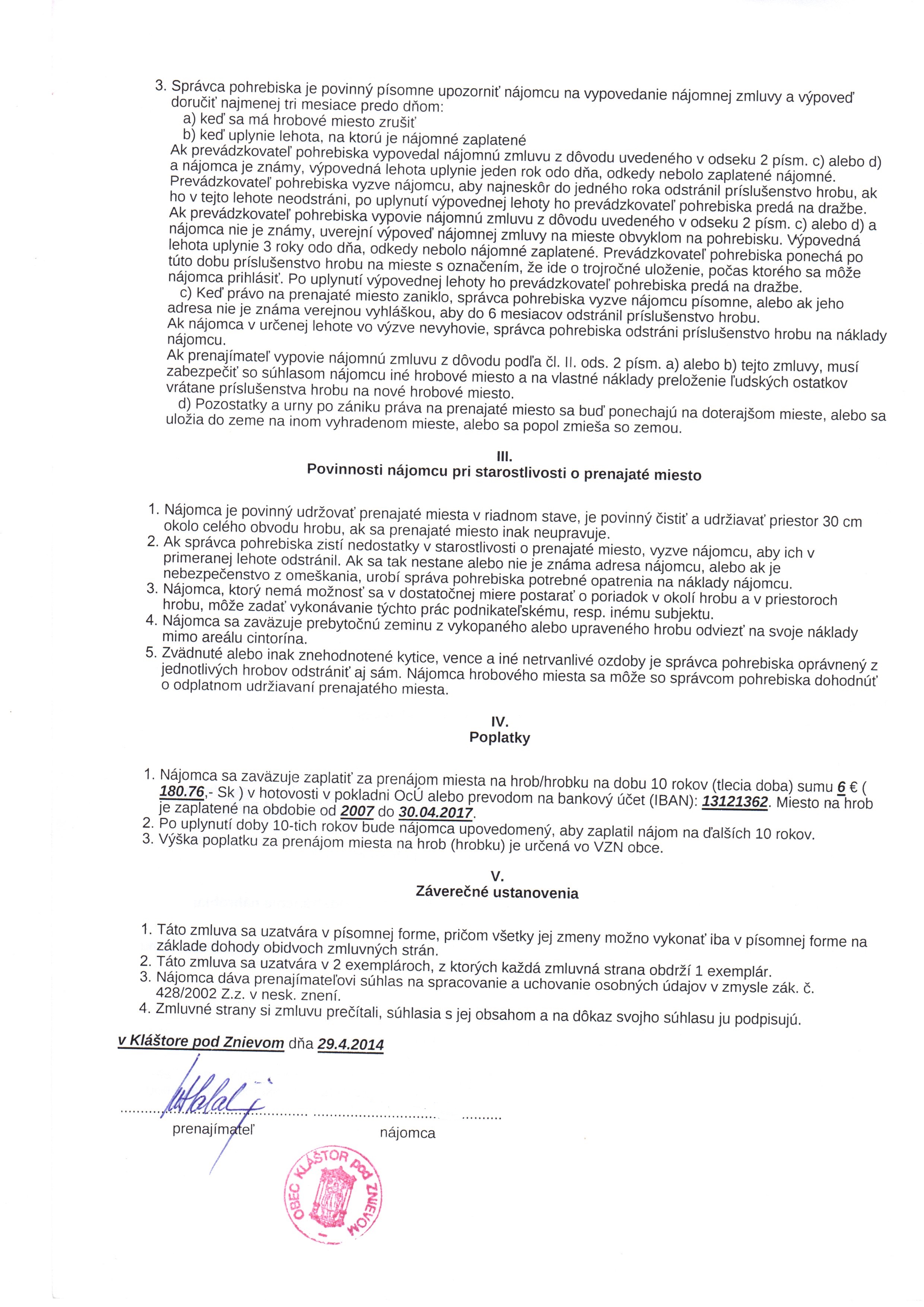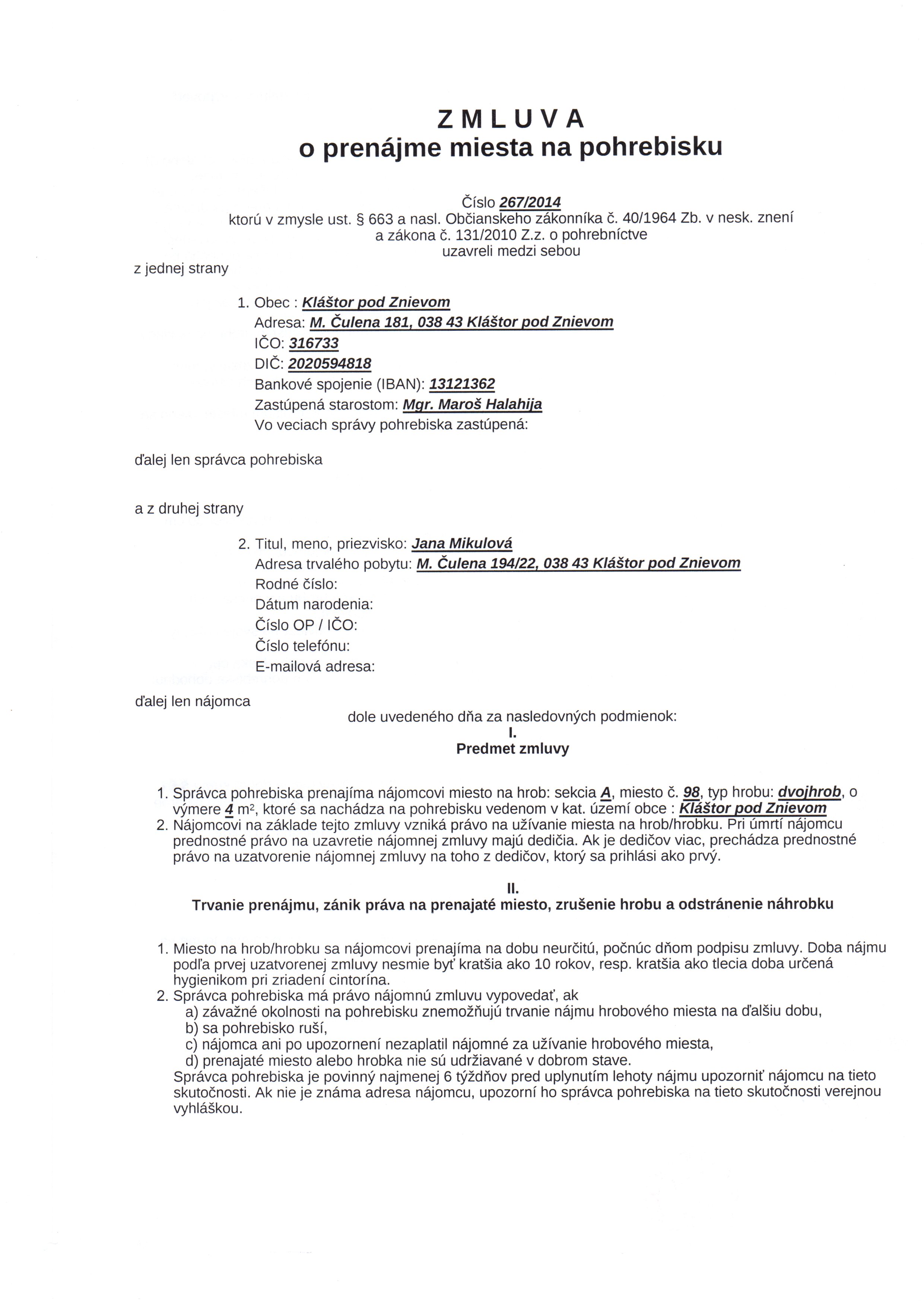 | Názov: | Zmluva o prenájme miesta na pohrebisku |