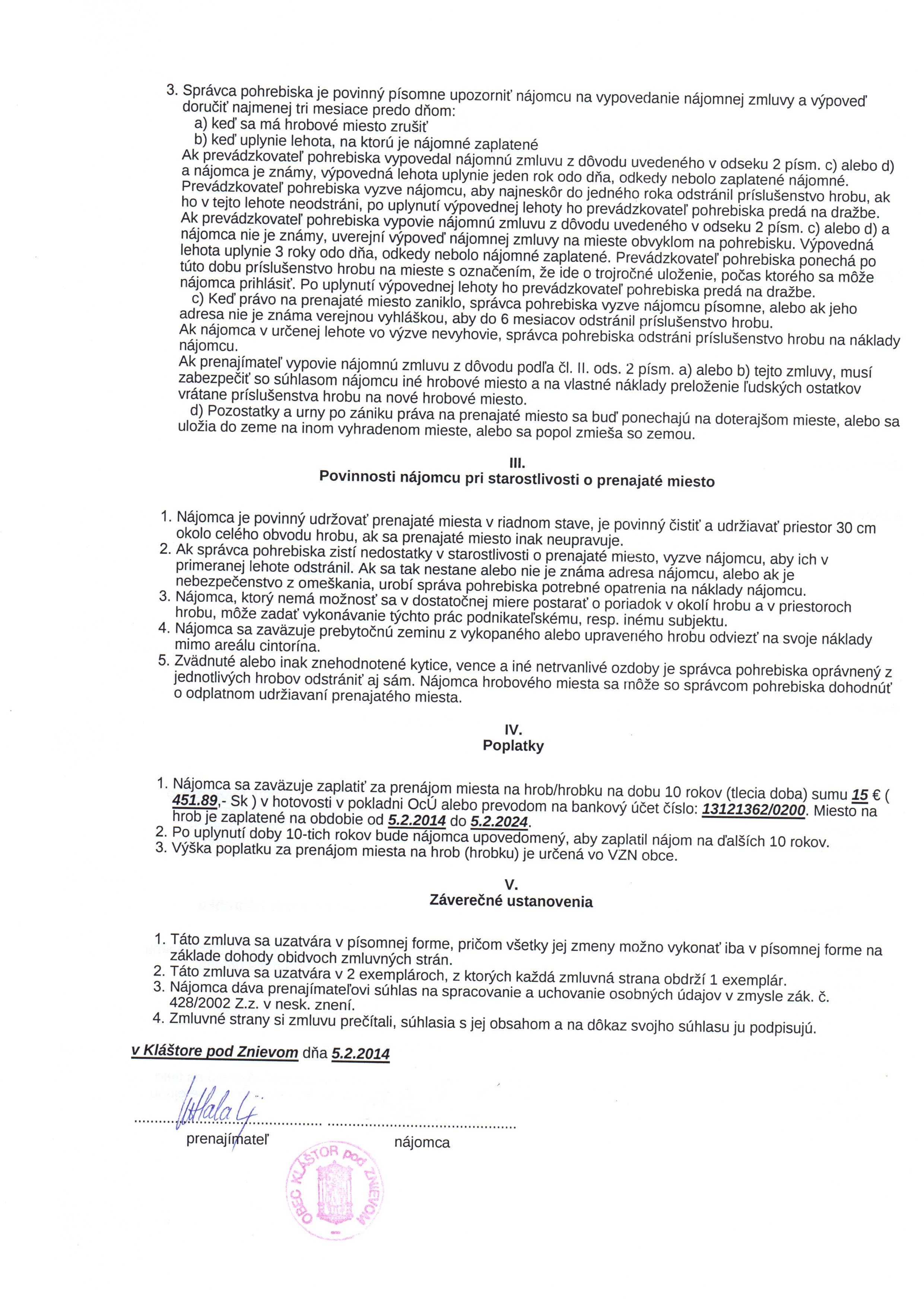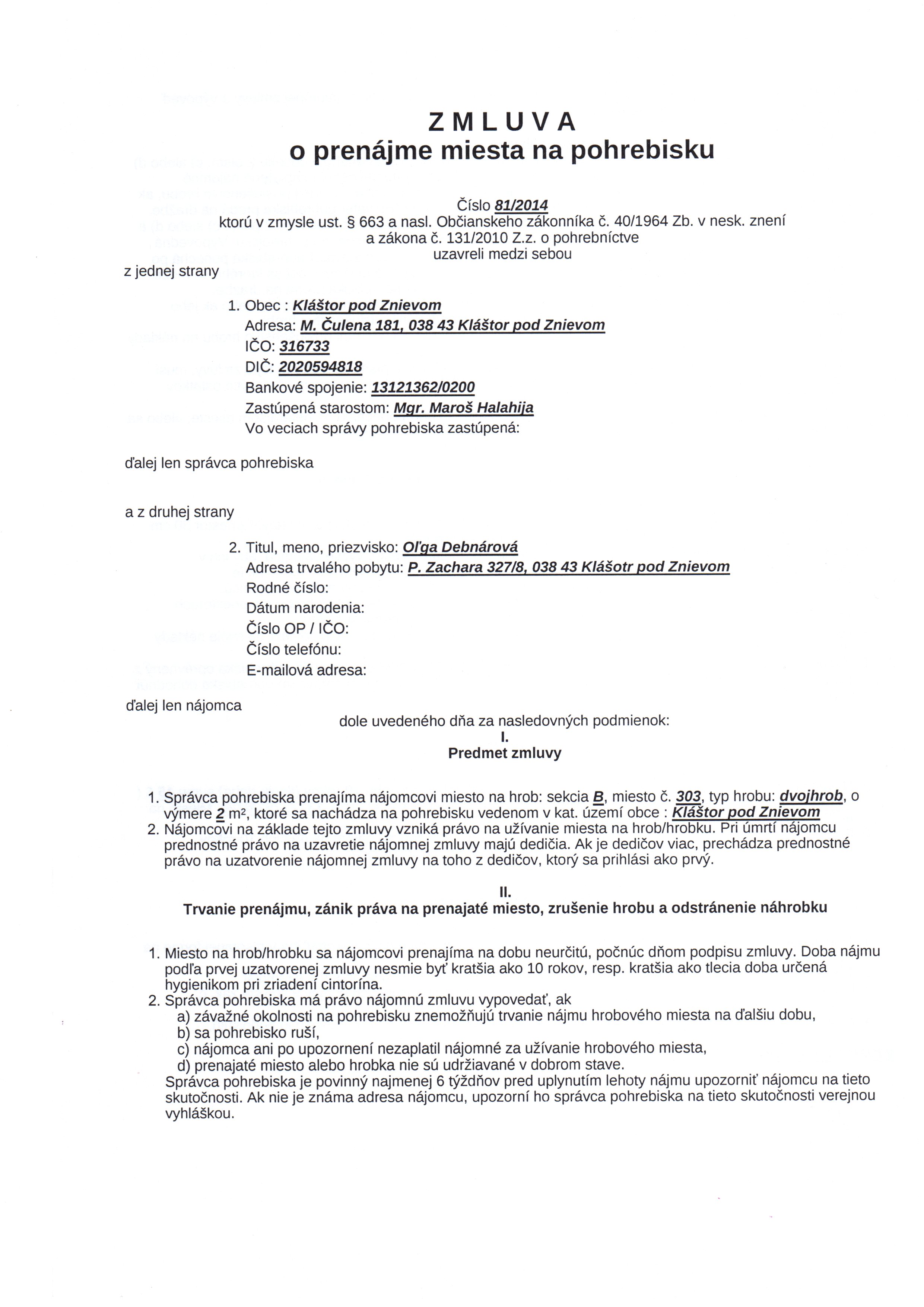 | Názov: | Zmluva o prenájme miesta na pohrebisku |