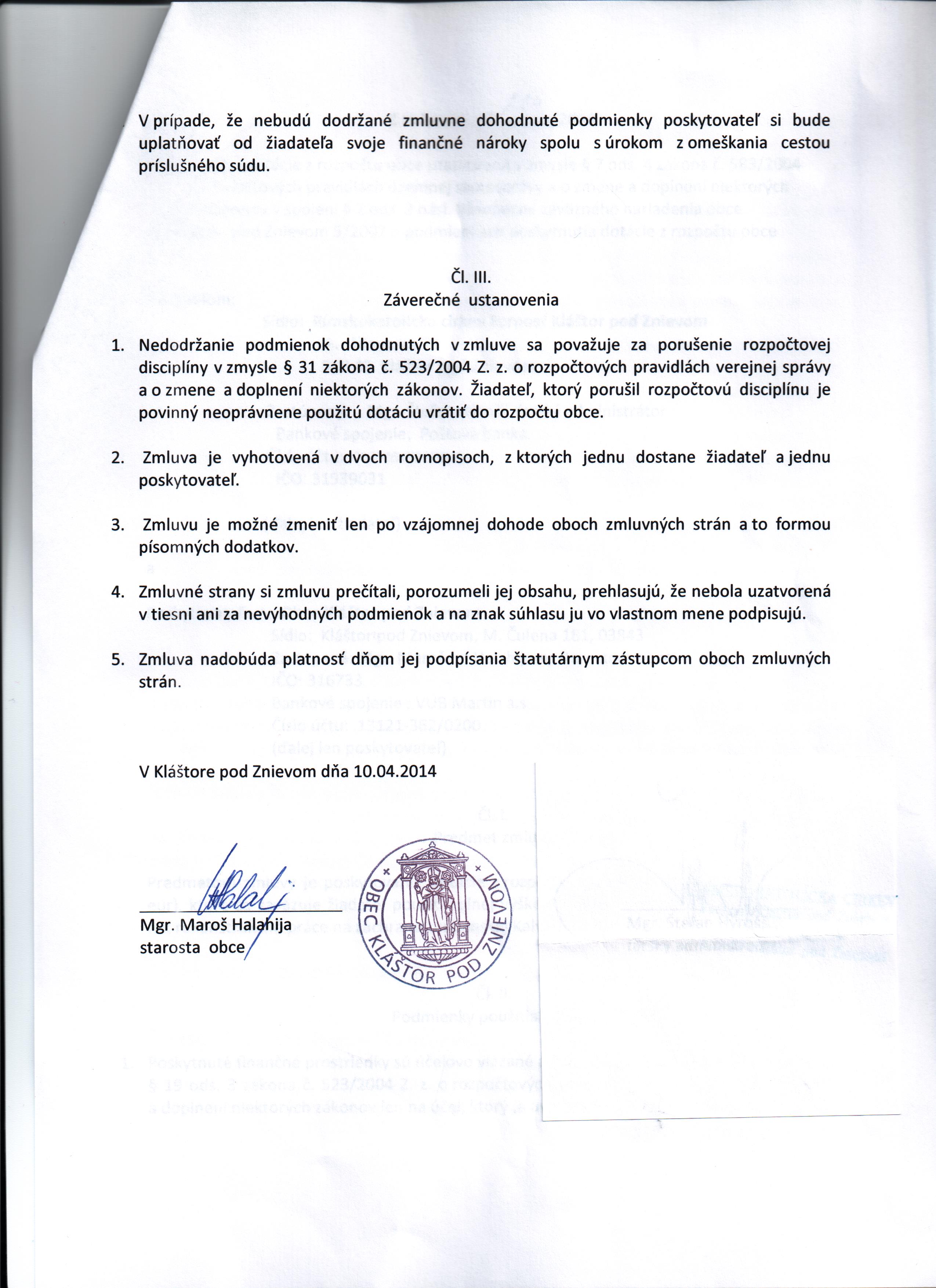 Zmluvy » subjekt: Obec Kláštor pod Znievom » rok: 2013