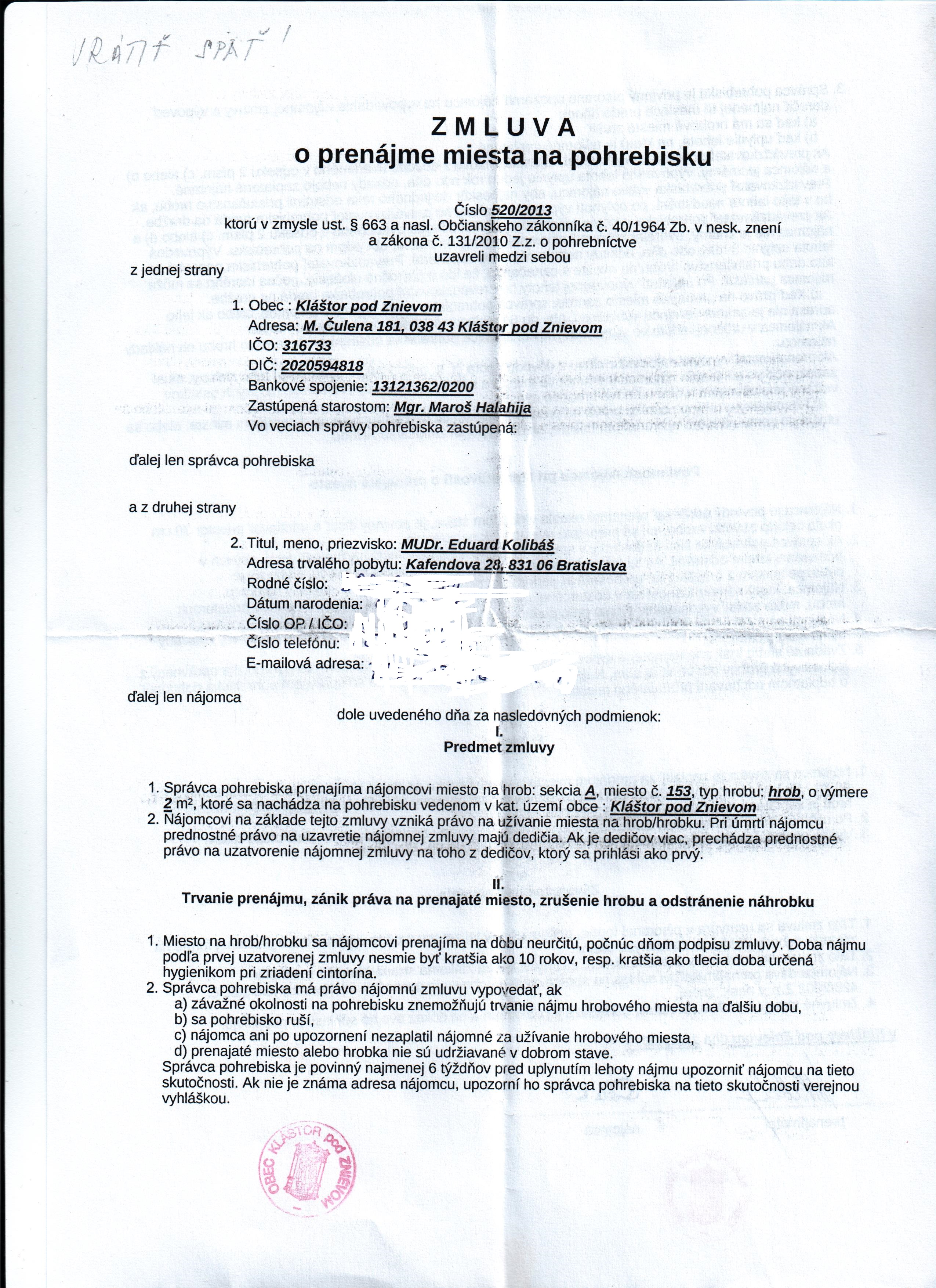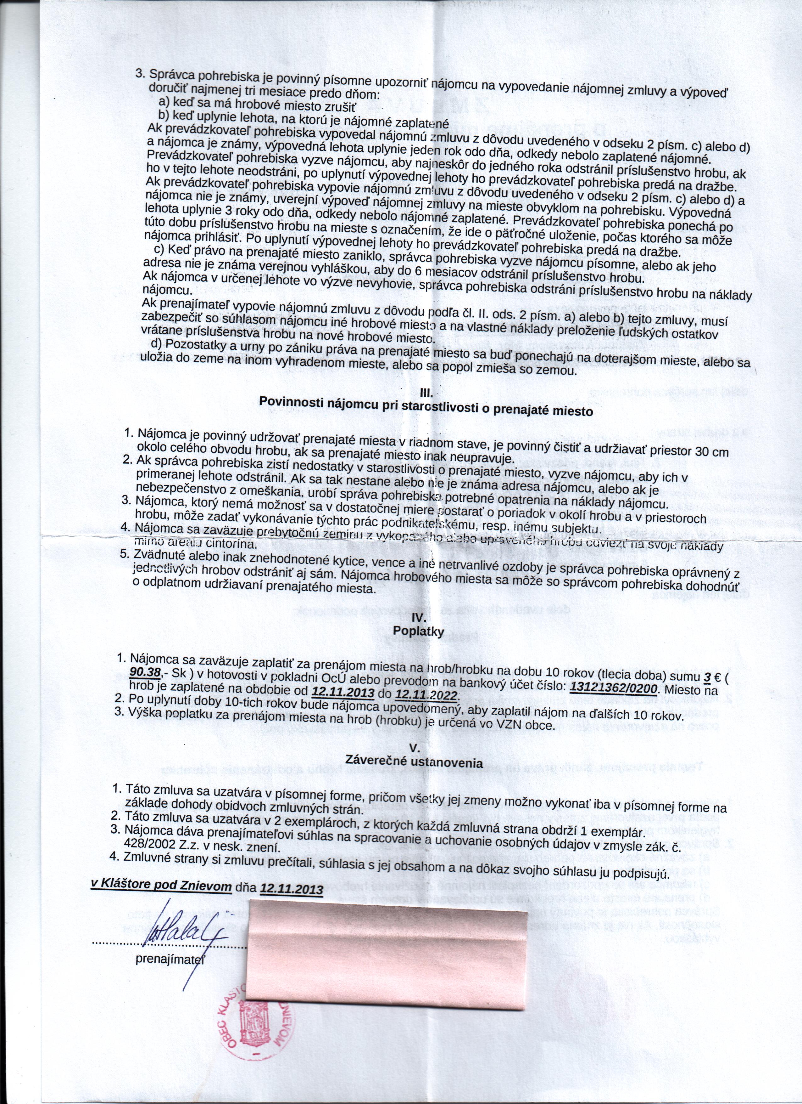 Názov:Zmluva o prenájme miesta na pohrebisku